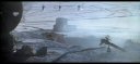 A part of the rebel trench system that has already been badly hit by Imperial fire. A dish turret lies wrecked to one side. The rising smoke and its shadow indicates that the camera faces east, and the prevailing wind presently blows from the east. Rebel soldiers run from east to west, moving to a trench that is closer to camera. The walkers may be approaching this point of the trench system. |