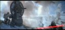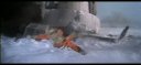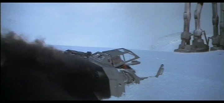 View from the cockpit of Rogue Leader as the snowspeeder crashes at the feet of an AT-AT walker. The walker is still headed SW, and Luke is heading towards the NE. |