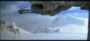 AT-AT walker, moving SW, is attacked from the front by a snowspeeder. The 'speeder appears to be shooting at two dark vents on the upper hull, showing that Luke's two-cable attack is not the rebels' only innovation in this battle. Northwestern mountains dominate the background. |