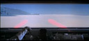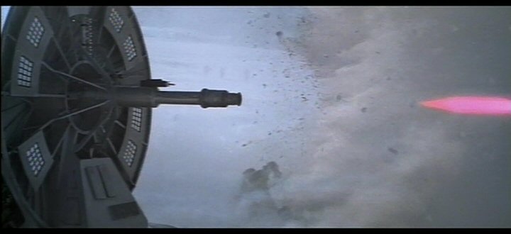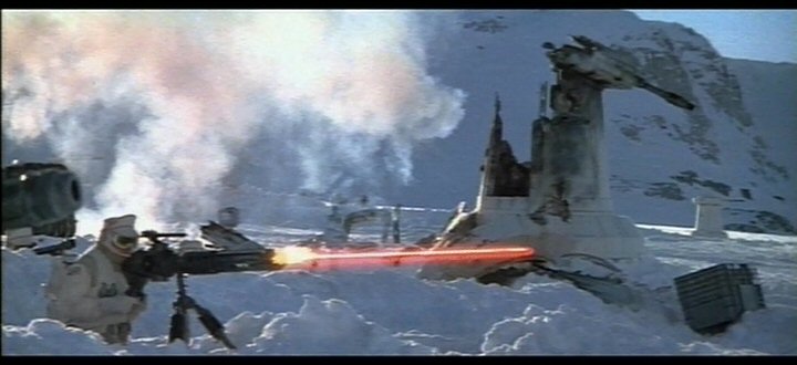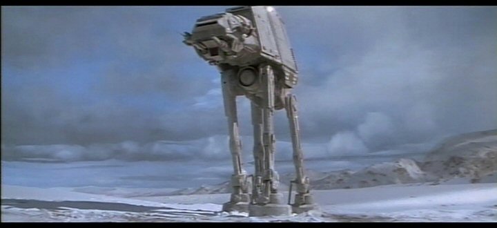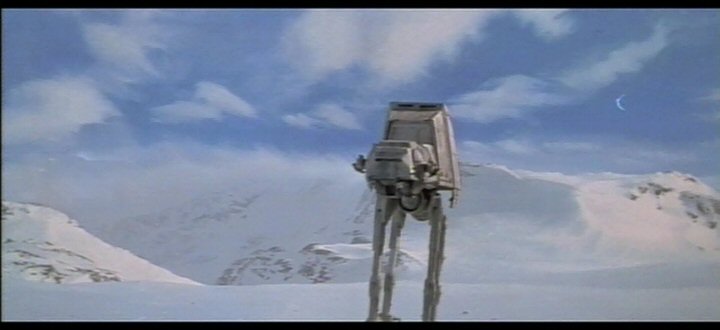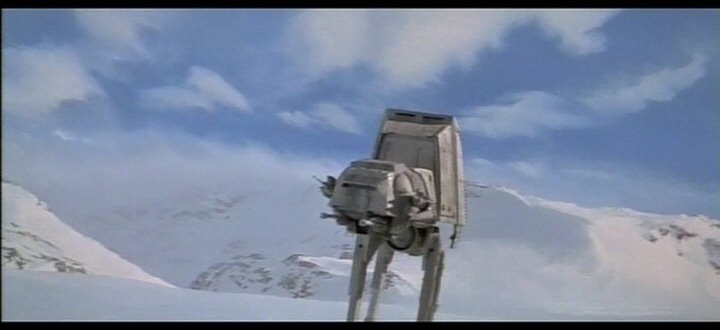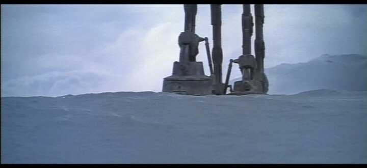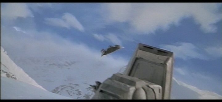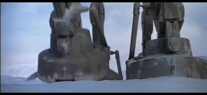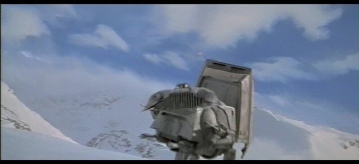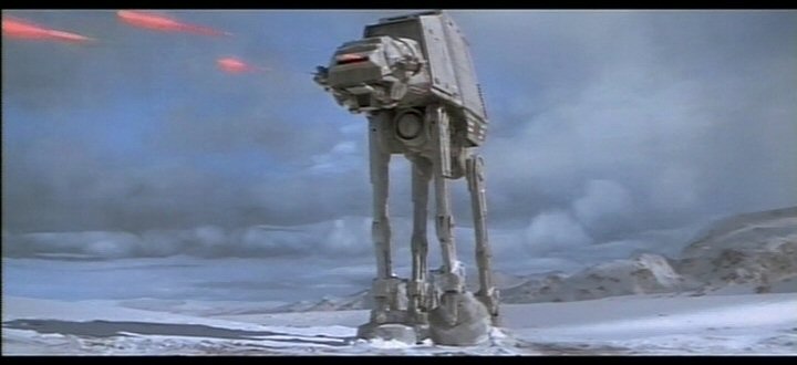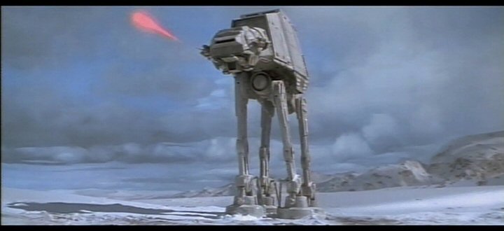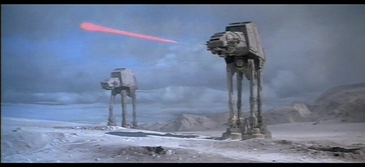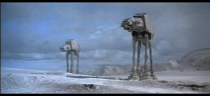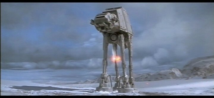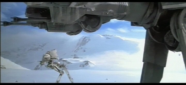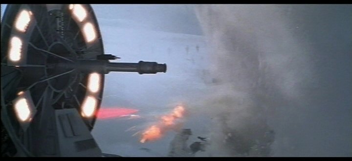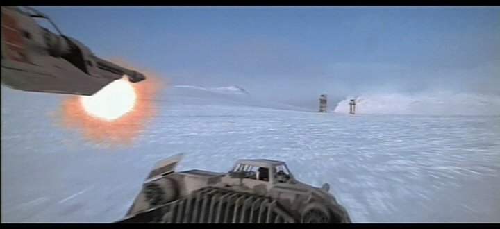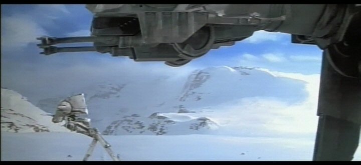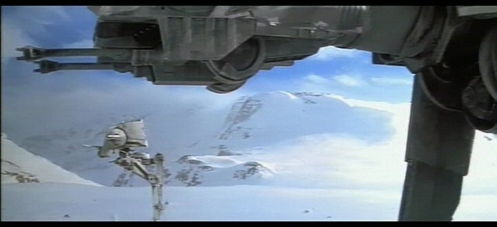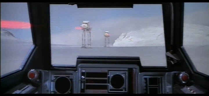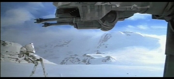 Two AT-AT walkers (standing amongst western foothills) as seen from Luke's snowspeeder cockpit. The walkers fire at the snowspeeders. |