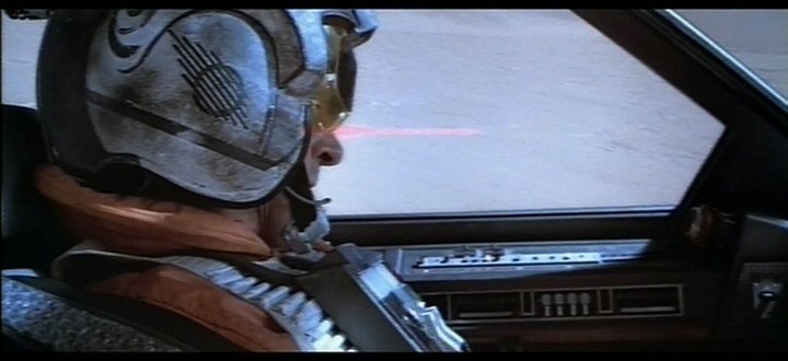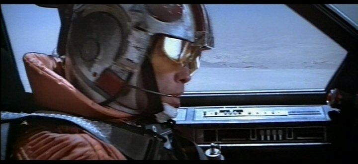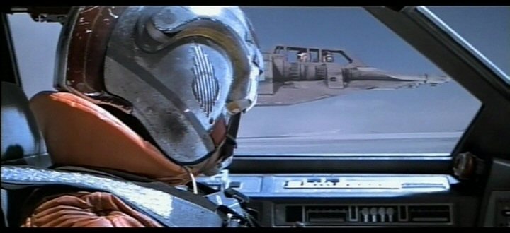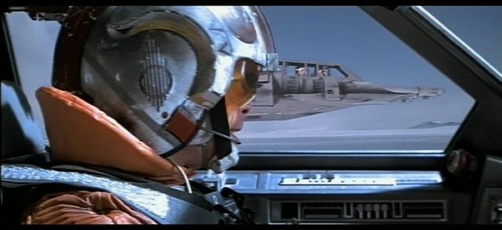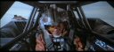 Rogue Leader cockpit. Luke glances left at Rogue Two. The lighting is difficult to read, but it may be shining from the camera direction, which would mean that the speeders are flying northwards. |