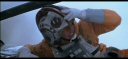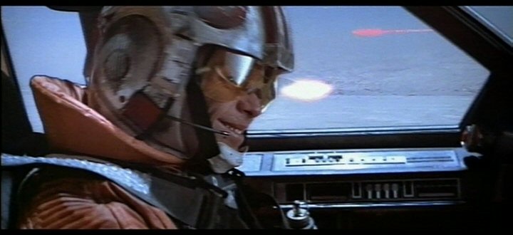 Rogue Two cockpit. Zev's face is bleeding. Sunlight falls from the starboard side, indicating that he may be flying generally northwards. Another 'speeder crosses his path at right angles, possibly heading west. Is this Hobbie's speeder joining Luke and Zev? |