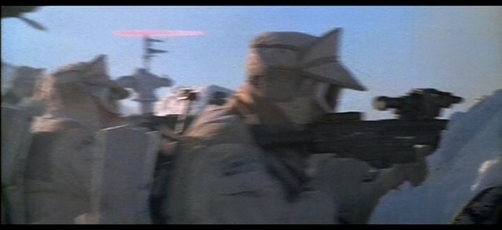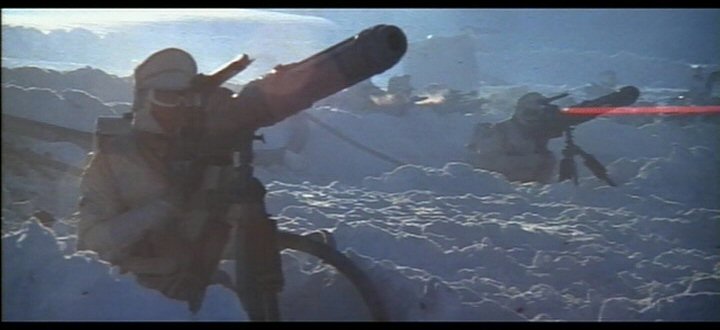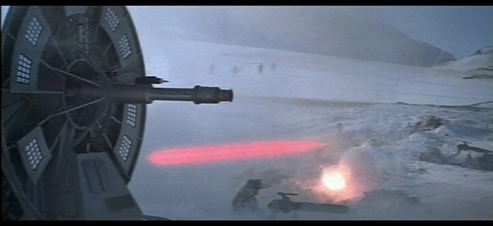 Two AT-AT walkers in the western foothills fire upon snowspeeders attacking from their front. The walker's shots dissipate in bright flashes: either a decay interaction in the ambient shield covering the battlefield, or absorbing in particles of snow which instantly vaporise. The sun is high. Clouds off the centre cast a faint shadow on the foothills to the left. |