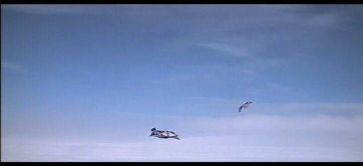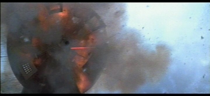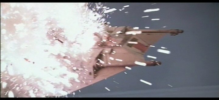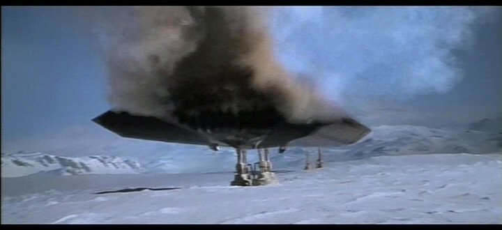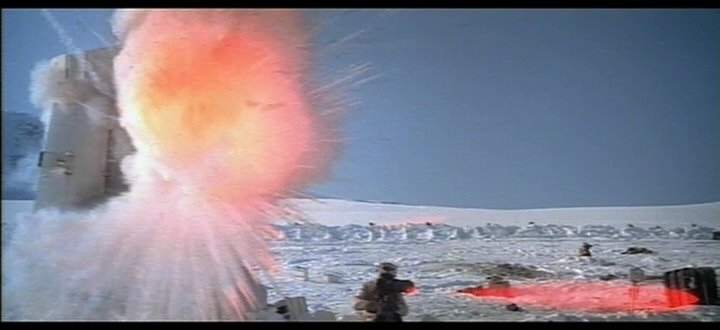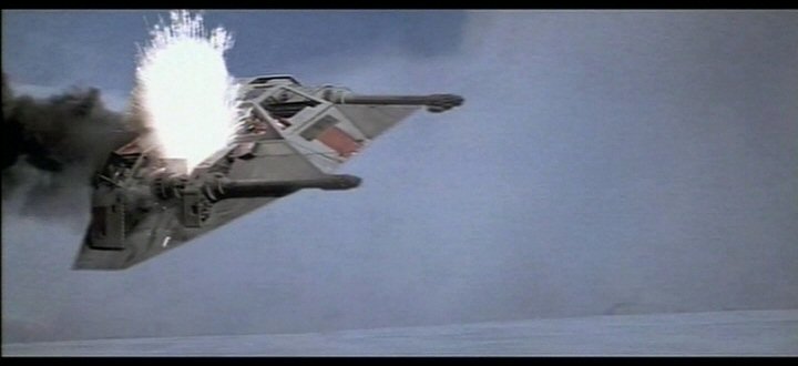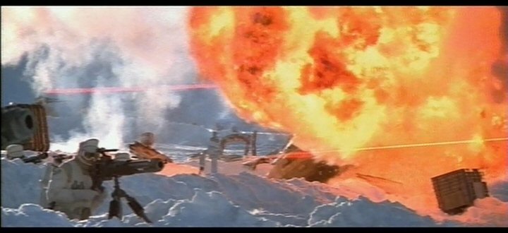 Explosion of Zev's snowspeeder. The sunlight appears to come from portside. If this is still morning then Zev is diving towards the south. |