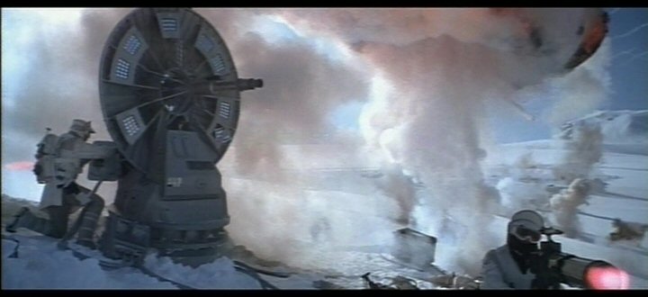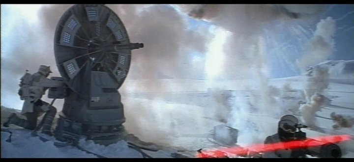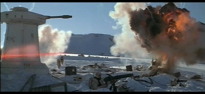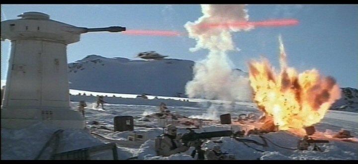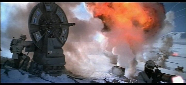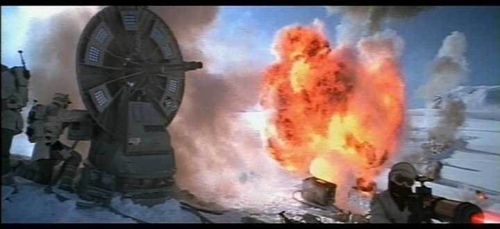 Rebel turret, facing northwards, is hit by AT-AT fire and explodes. |