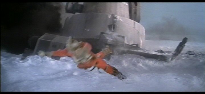 Rogue Leader, crashed in the ice. Luke attempts to push open the cockpit canopy. The shadows aren't clear enough to tells us the direction, but it is safe to assume that the 'speeder crashed facing northeast: its last trajectory in the air. |