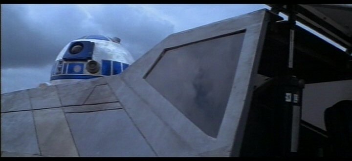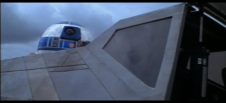 R2-D2 seated in Luke Skywalker's X-Wing fighter.