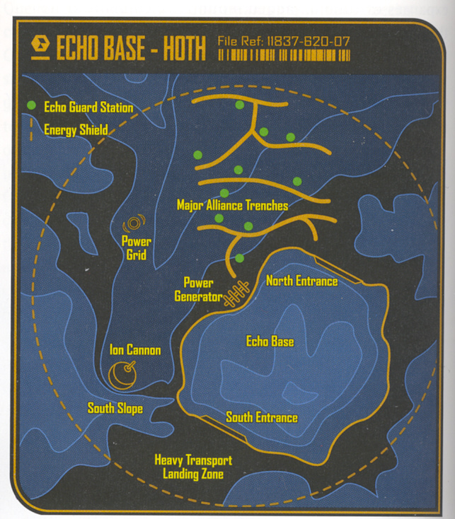 Echo Station 5-7, the first major fortified area to see the AT-AT walkers over the horizon [in the movie], appears near the northern extreme of the shielded area in this map. This station must be at least 20km from the North Ridge. If the walkers fired at 5-7 from within the shield perimeter then the implied scale of this map makes the generator well over a hundred kilometres away. The 50km shield diameter indicated in EGWT would then be an underestimate.