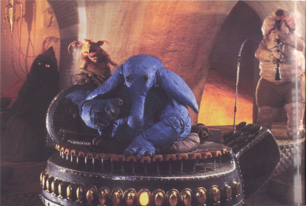 One of the gargoyles is a rancor, with its arms drawn neatly together in front of its body. This choice suggests that the gargoyles collectively represent animals or sentients who were regarded with pride or affection by Jabba. (Jabba probably commissioned an artist to sculpt a representation of his own private rancor.)