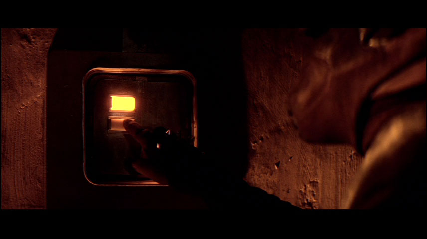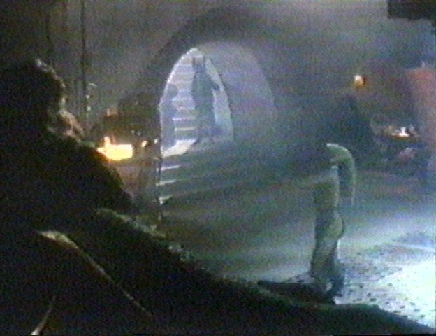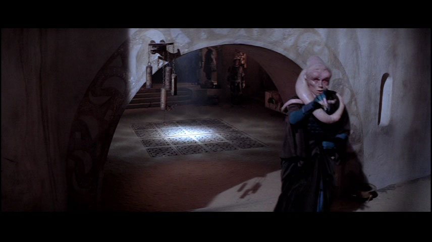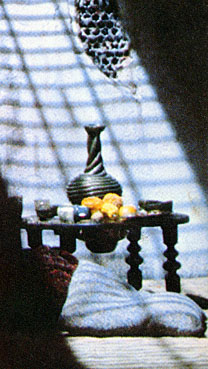Hooka fittings at the head side of Jabba's throne. First image: behind Calrissian; second image: above and behind the man and yuzzum; third image: to Jabba's left, above his head; fourth image: right side, far behind the Gamorrean (whose back is turned to Jabba); fifth image: far wall, behind Bib Fortuna (ignore extratextual foreground film crew). [Behind the Magic; Star Wars to Jedi: the Making of a Saga]