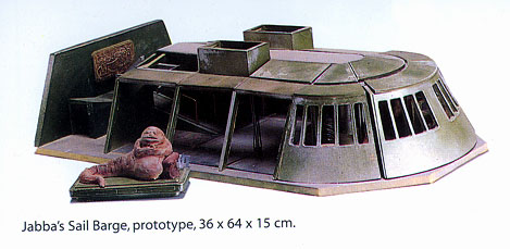 Prototype model for the observation deck of Jabba's sail barge. The mural is clearly located amidships, on the first landing of the multi-level rampway leading to the top deck. The presence of the artwork in this early conceptual model of the barge indicates its importance to the overall set.