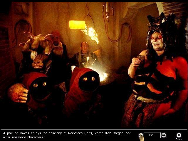 Booths 2, 3 and 4 seen from the middle of the room. Hermi Odle and Elom are identifiable in booth 3, the hooka of which is visible also. There is a panel of switches on the pillar between booths 2 and 3. Part of Max Rebo's instrument is visible to the right of booth 4.