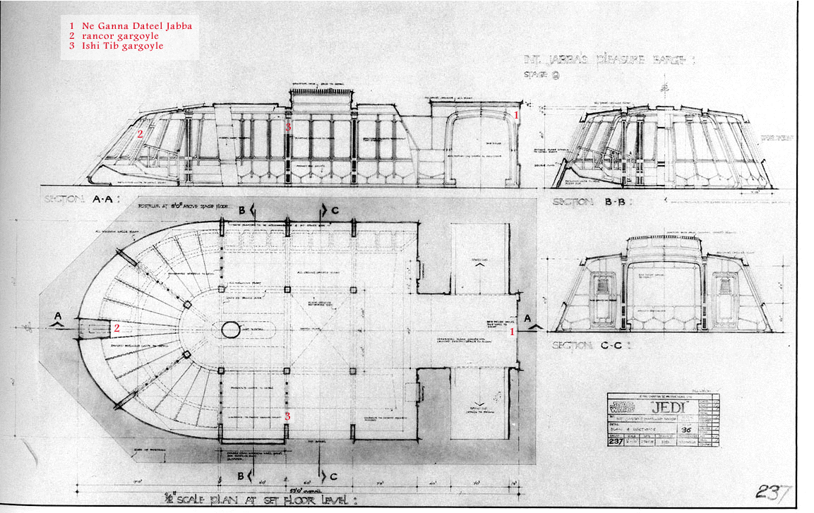 Schematics of the sail barge interior. The rancor gargoyle, which is probably the largest one, appears to be on the thick, central truss at the forward end of the observation chamber.