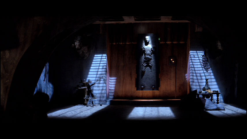 Jabba's favourite decoration was a unique work of art created by Lord Darth Vader. It is an improvised container for the imprisonment of a man placed in hibernation. Use of this particular subject brought great personal satisfaction to Jabba, because Han Solo was a debtor gone bad and brazen, and also a formerly trusted employee who turned traitor against the Hutt's authority. Display of the helpless, hapless Solo had practical benefits as well; it sent a powerful message to other potentially-wayward minions and members of Jabba's court.