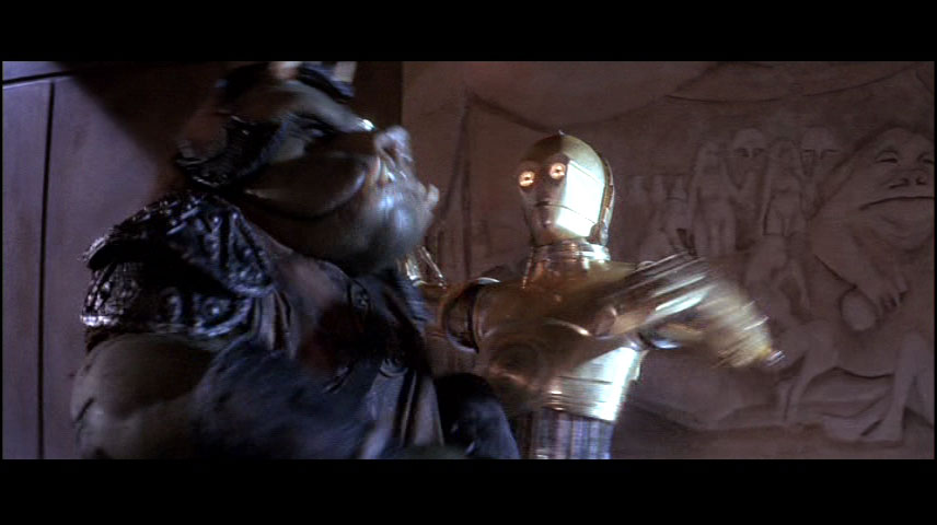 Ishi Tibe gargoyle is visible behind three humans on the far left; the opposite gargoyle is visible but unidentifiable above C-3PO and Bib Fortuna at the far right.