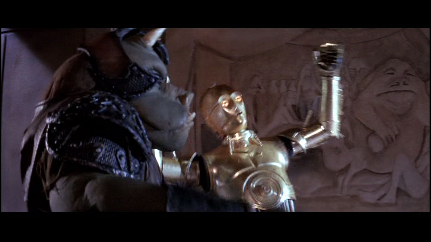 The table, the fruit, C-3PO, the stairs near Jabba's left hand, and a Yuzzum onlooker.
