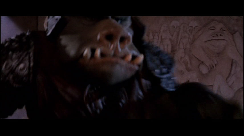 The tauntaun trophy again in closeup, though poorly lit, surrounded by a jawa, a gamorrean and an amanaman. The dried human head is actually an ornament on the amanaman's trophy staff; it is not part of Jabba's collection.