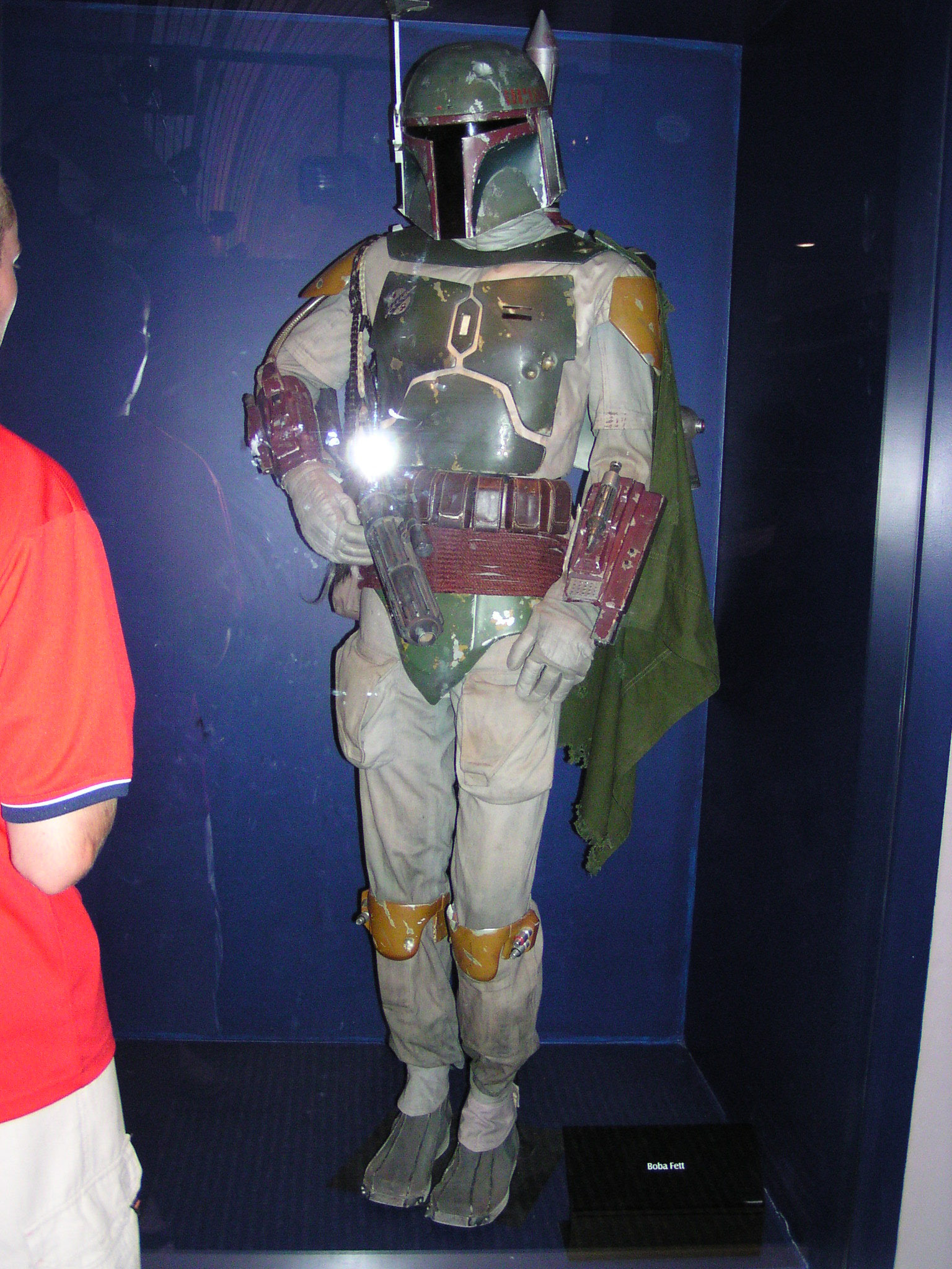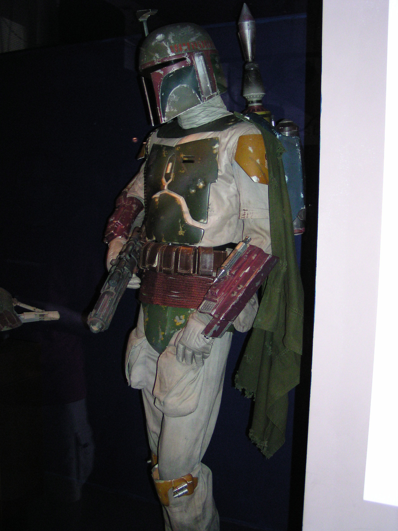 Overall frontal view of Boba Fett's costume. Braided wookiee scalps hang over his right shoulder. The olive green paint on his torso armour appears to have a yellow undercoat. Rocket dart launchers in the horizontal devices on the sides of both kneepads. [Jan 2003] |