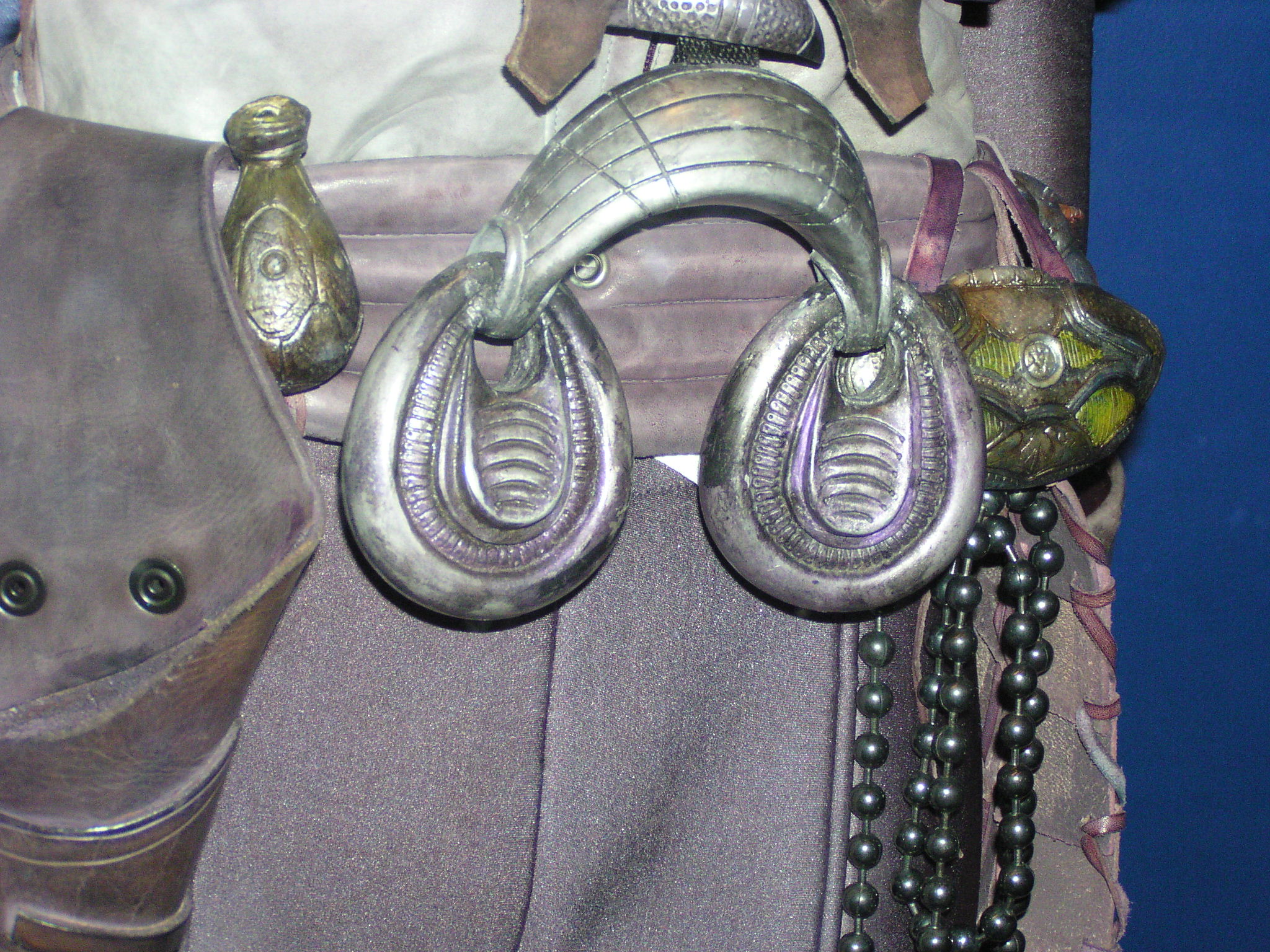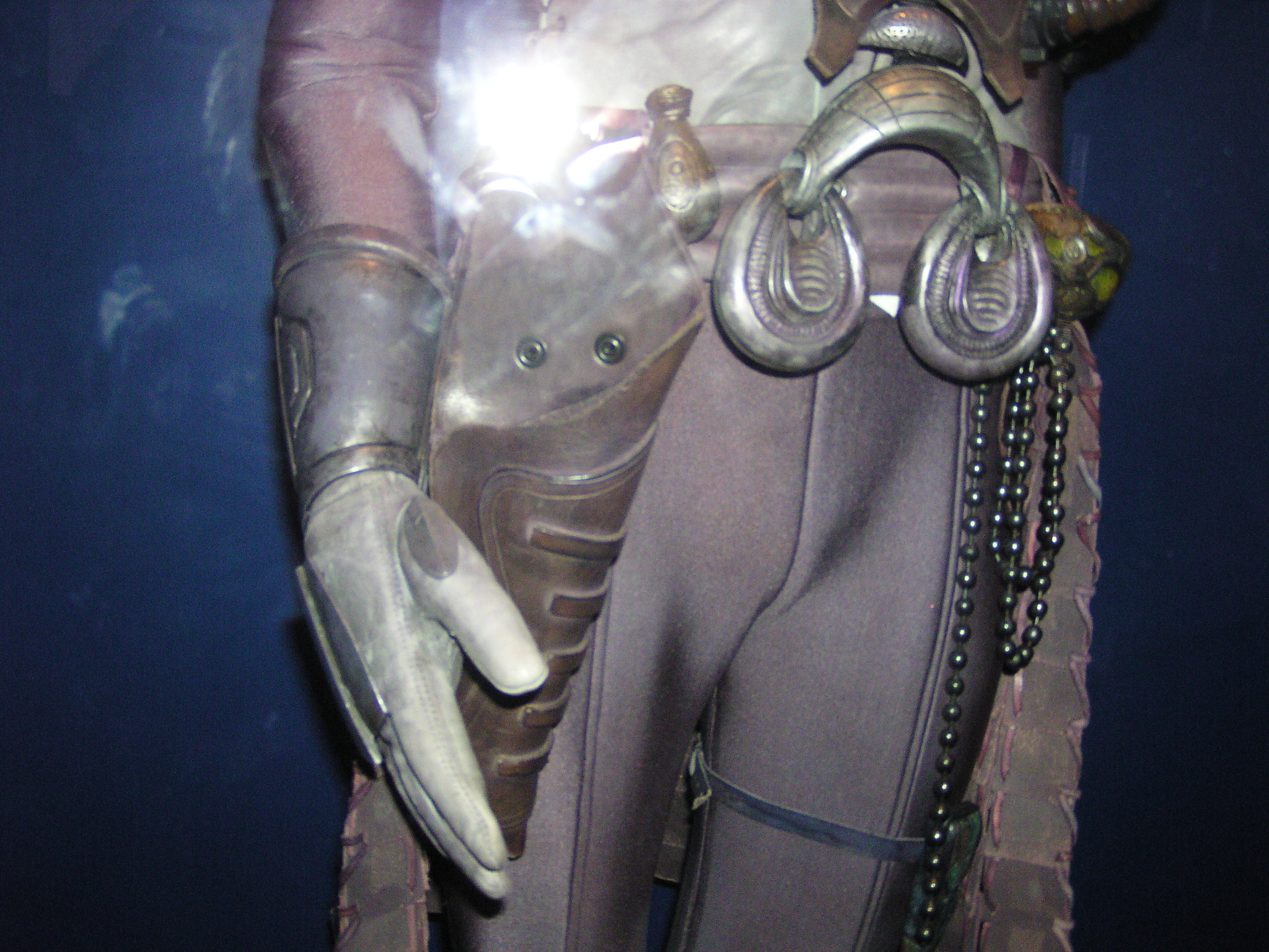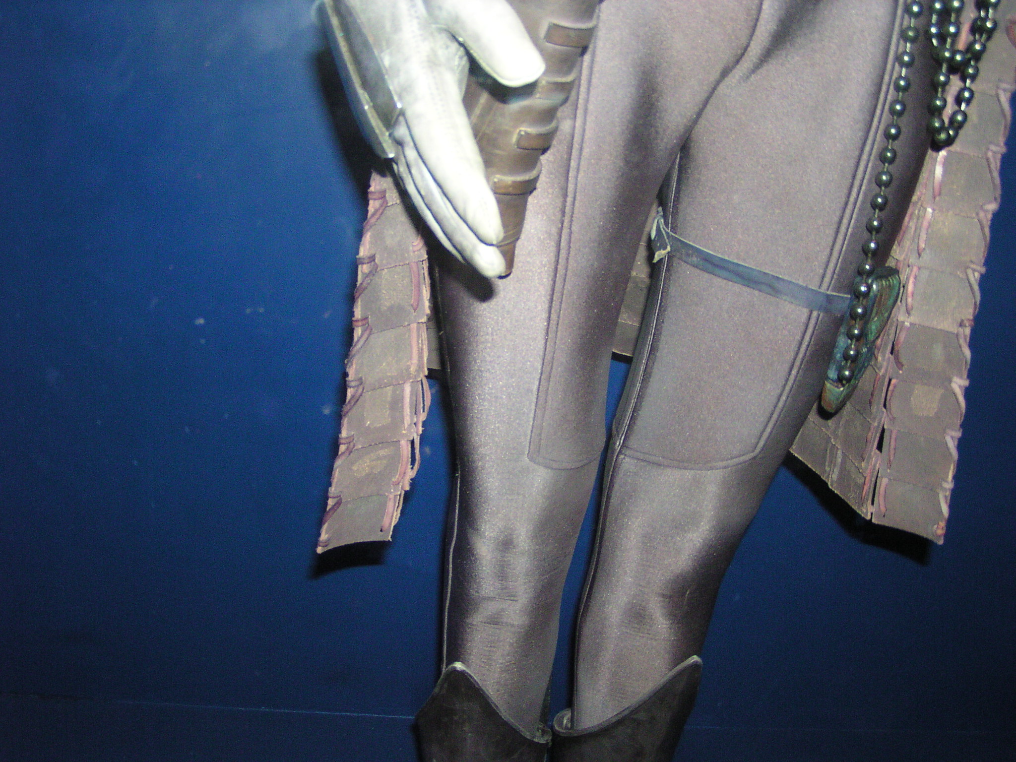 Middle leg area of Zan Wessel's costume. She has a scabbard bound to her left thigh. Beads, of unknown function (garrotte?), hang in front of and above the scabbard. She wears a blaster holder at her right hip, implying that she's right-handed. (It should not be taken for granted that non-human species differentiate with left and right preferences.) [Jan 2003] |