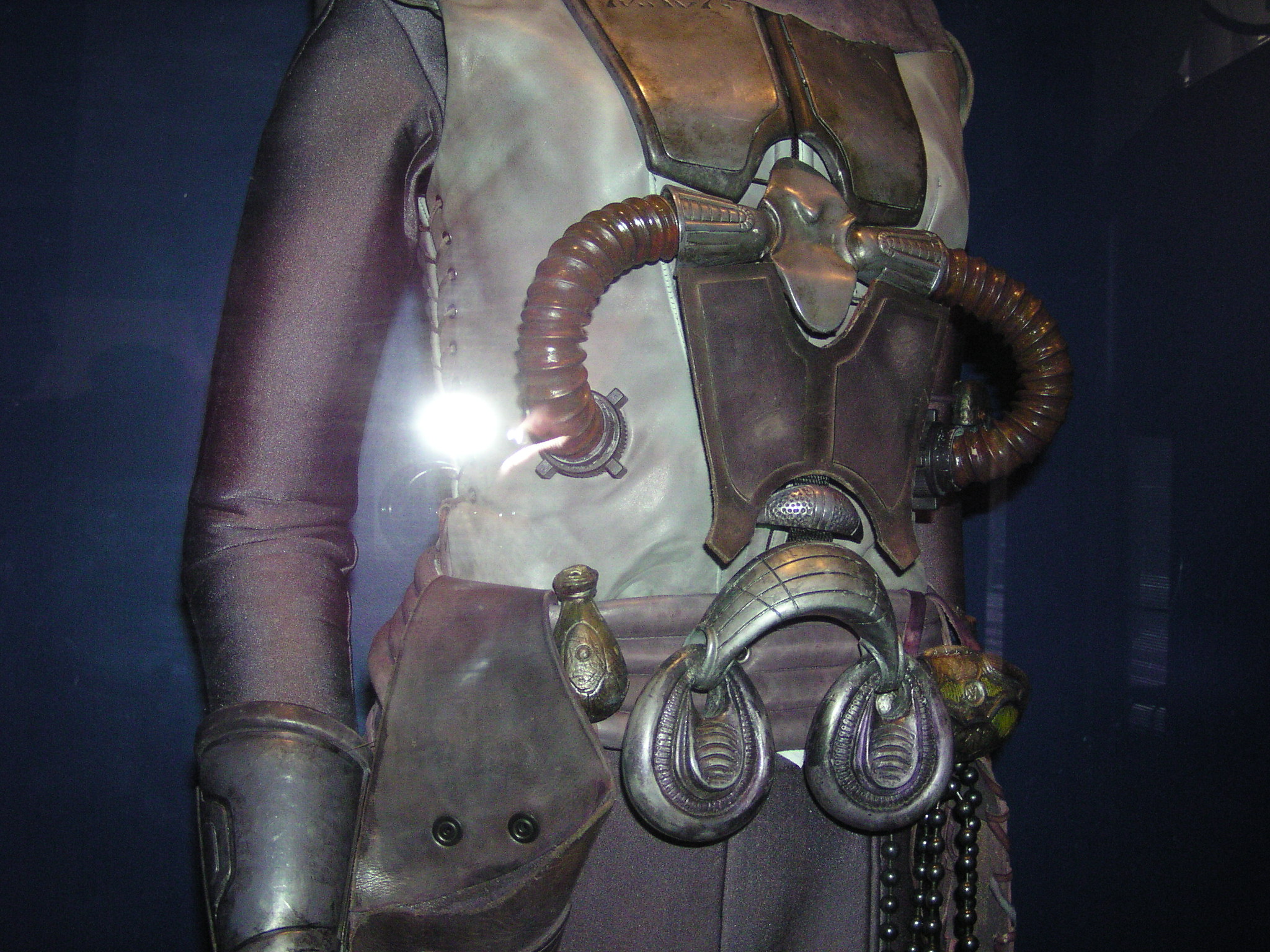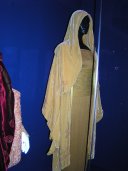 A full view of one type of Naboo royal handmaiden/bodyguard uniform. Thin, complex red designs appear on the hood and sleeves. It would be interesting to know whether these markings are individual or the same for all the handmaidens. Are they meaningless or are they a form of composite lettering, a kind of Naboo calligraphy? |