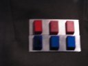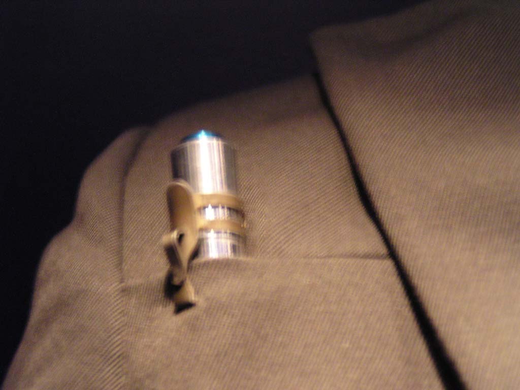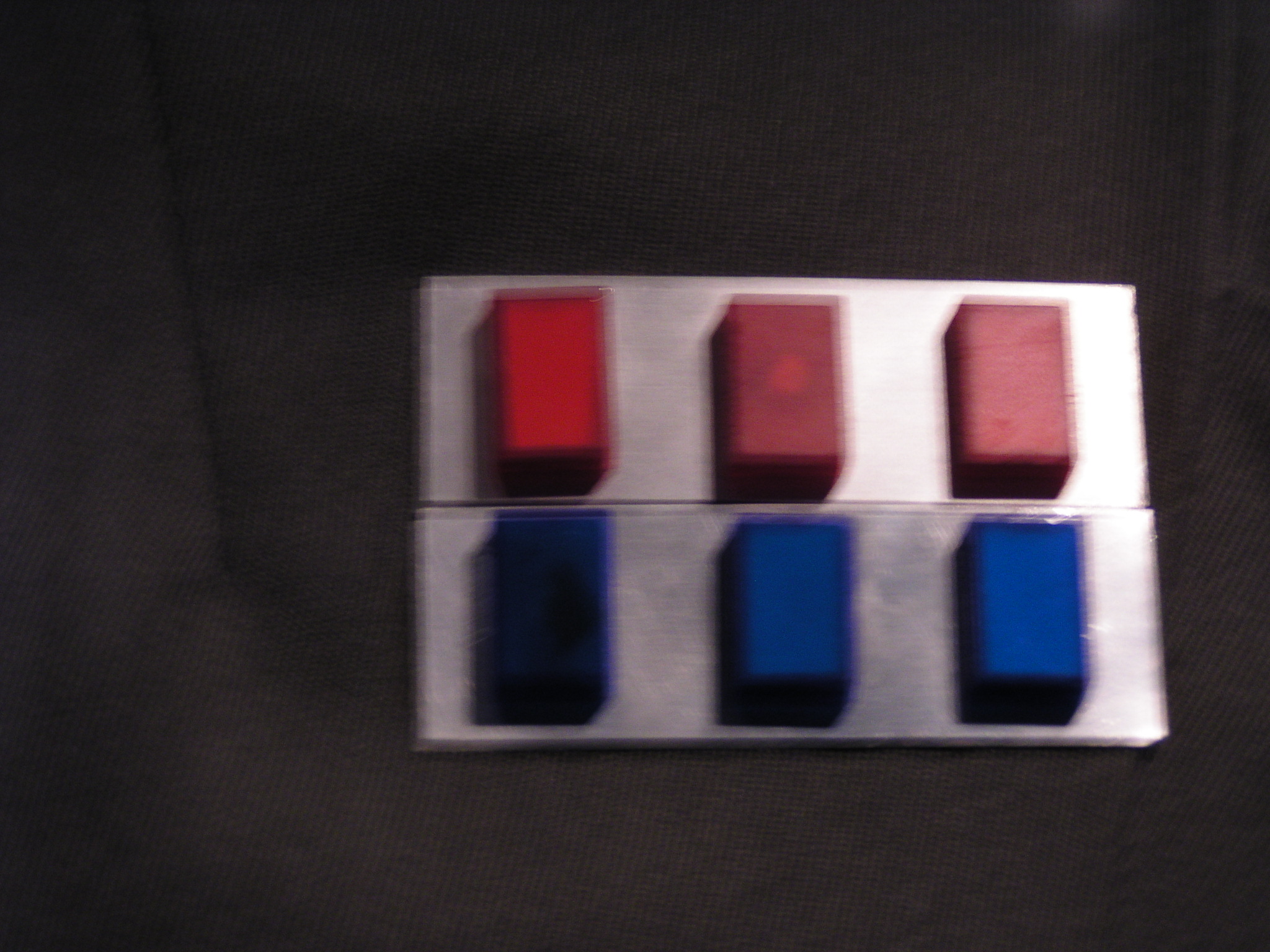 Closeup of Imperial officer rank plaque, with three red and three blue units. The units are made of a translucent, partially reflective material. The metallic base is composed of two wide sections, one above the other. |