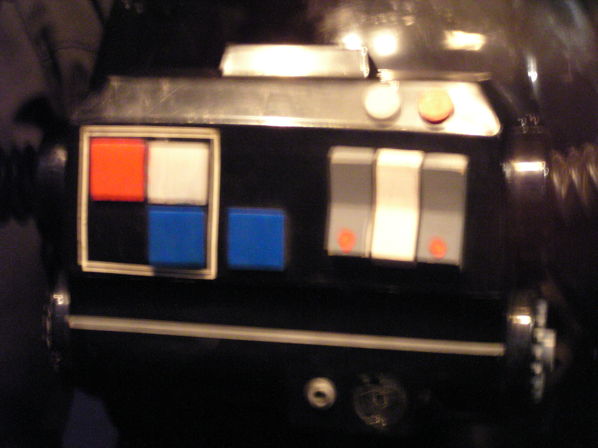 Closeup of the chest box worn by Luke Skywalker as an X-wing pilot. Note the air hose protruding from the bottom of the box: its presence hints that the box does something in relation to air supply, air scrubbing or thermal life-support functions. What is the good of this device when the pilot's helment is normally open to the surroundings? The three equally sized, vertically oriented switches (white, grey, white) at the bottom of the box resemble a triplet of switches on the chest box worn by an Imperial TIE fighter pilot. |