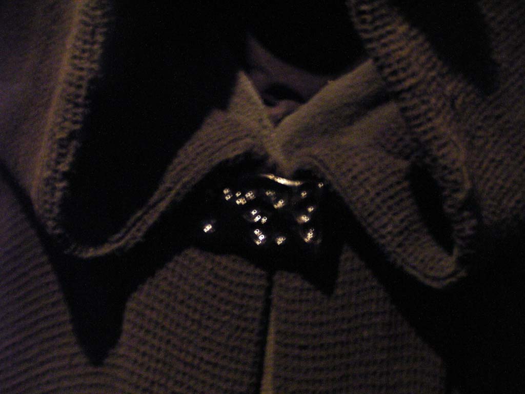 Closeup of the clasp at the front of the hood on the Emperor's robe. The substance of this object resembles obsidian (like the Emperor's walking stick); the shape is indistinct and intriguing. What does it represent? |