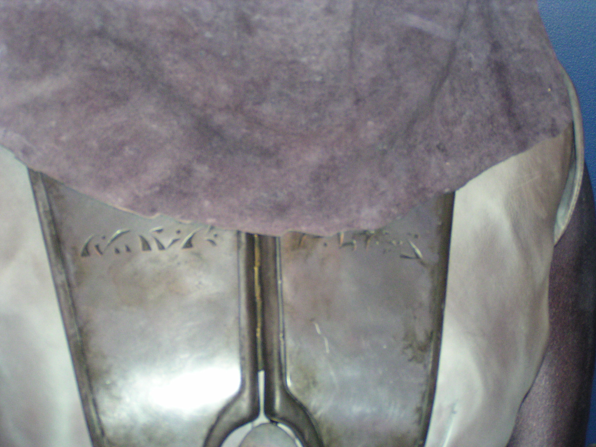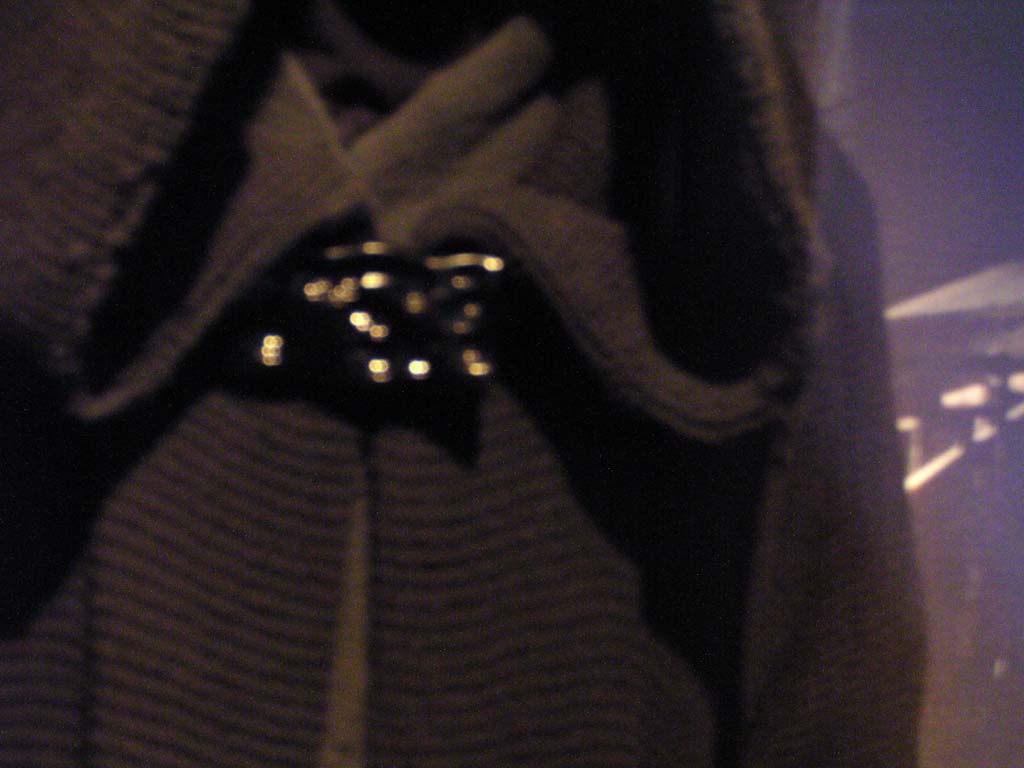 Another photo of Calrissian's baronial belt buckle, with clearer contrast but unfortunately low resolution. Three vertically aligned, diamond-shaped impressions on the buckle are visible to close inspection. [Jan 2003] |