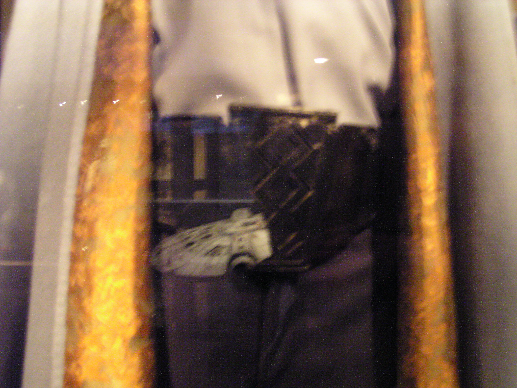 Closeup of the fine golden trim on the hems of Baron Calrissian's cape, and his very thick belt. The buckle is almost large enough to be mistaken for a codpiece, and bears a peculiar zig-zag emblem. It is not yet known whether this is a symbol of Cloud City, Calrissian personally, or something else. A reflection of a distant model of the Millennium Falcon is superimposed. |