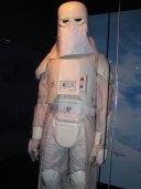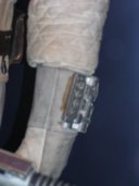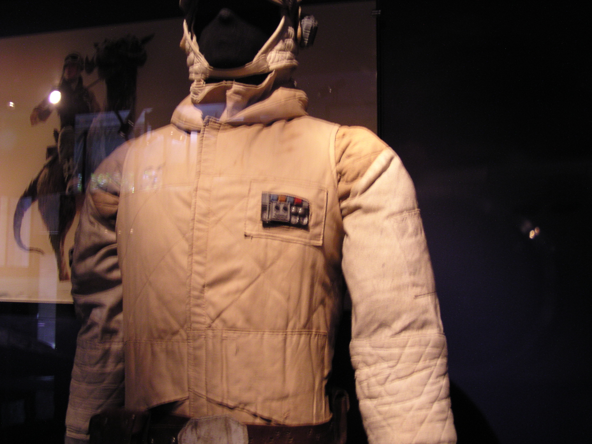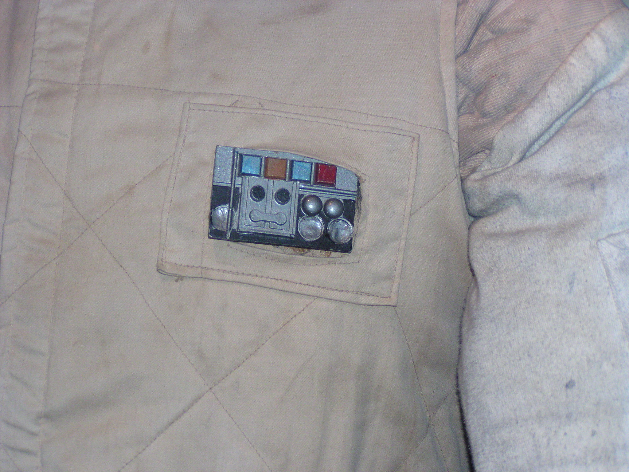 Skywalker's parka worn on Hoth. The device at his left breast is marked with four coloured squares that seem reminiscent of Imperial rank plaques, and they probably serves as rebel rank insignia. The second square from the less seems tinted orange rather than red, but this may merely be due to discolouration of the aged costume, or an effect of the light in this particular photograph. |