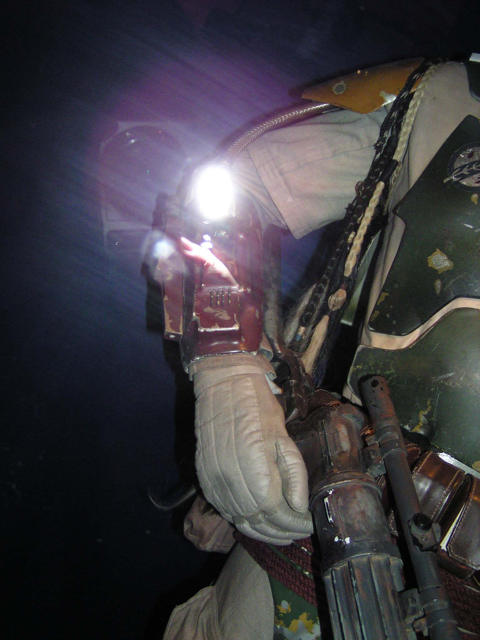 Somewhat-blurry photographs of Fett's left gauntlet, which is armed with a flame-thrower. |