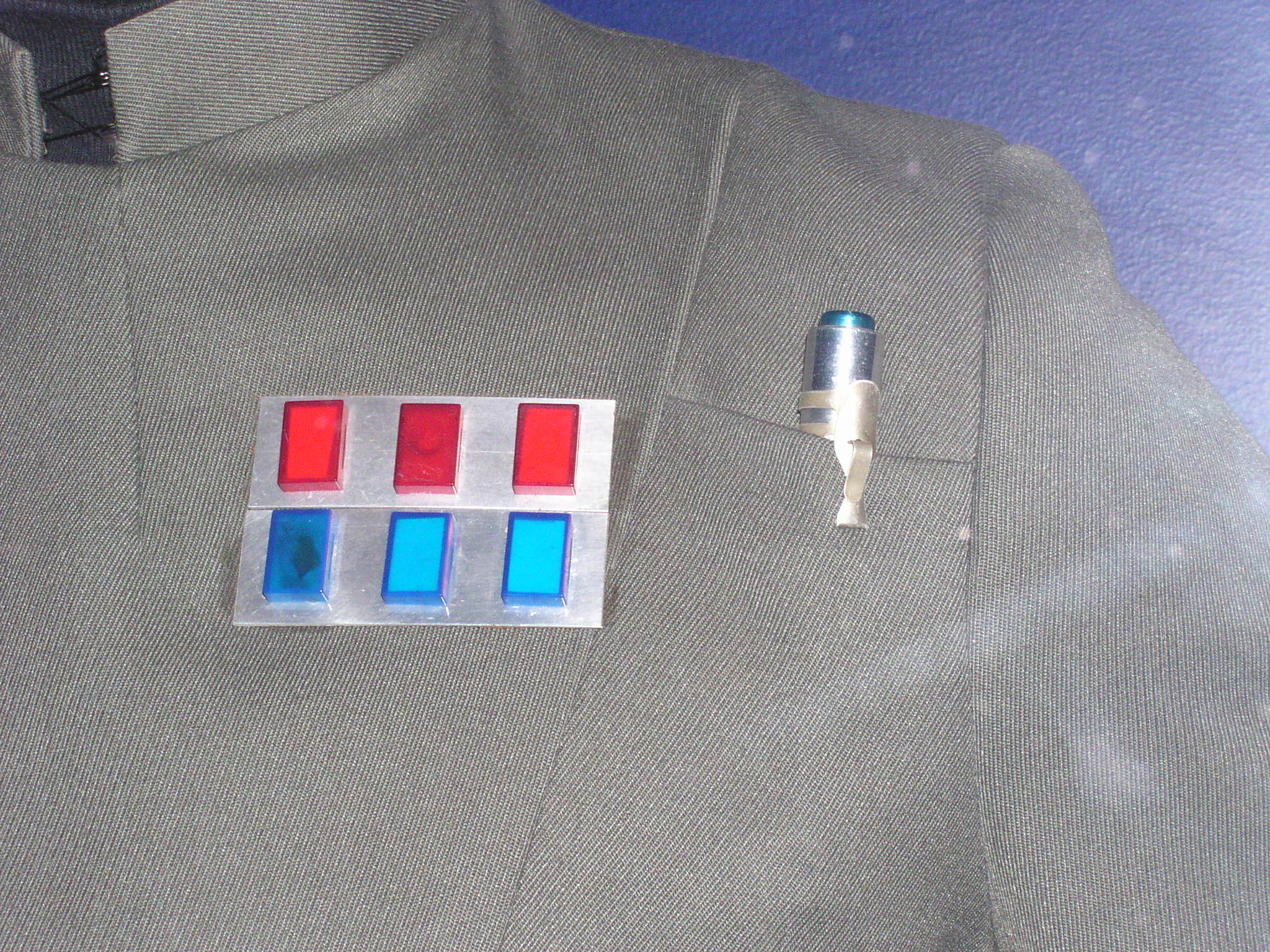Close view of an Imperial officer's rank plaque, left shoulder and collar. The wings of the collar are closed together in the normal way of wearing the uniform [in the movies] but that may have been difficult to achieve because of the width of this mannequin's neck. |