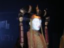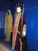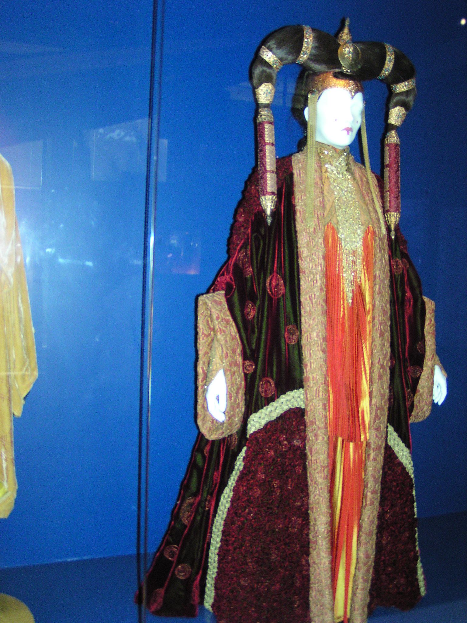 Queen Amidala's elaborate costume and headgear worn during her appeal to the Senate of the Galactic Republic during the invasion of Naboo. It is difficult to guess the function of any parts of the costume, except as decoration and to make her appear larger. What, for instance, are the cylinders hanging from her hairstyle and what adheres them in place? A handmaiden costume is visible in the left background. [Jan 2003] |