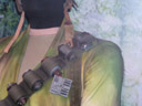 Zan Wessel's torso, showing the perplexing relationship between armoured panels and hoses (which appear to enter her body perpendicularly). The green device on her left side is of unknown function. The outer vest is laced together like a shoe or corset; the laces are visible beneath her right armpit. [Jan 2003] |