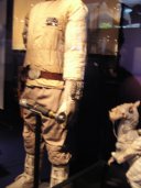 Overview of Luke Skywalker's outdoor uniform worn on Hoth, shown from shoulder to ankle. Luke's lightsabre from ROTJ sits in the foreground; a tauntaun model appears on the right side of the photo. |