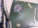 Boba Fett's helmet and shoulders. His green cape appears to be bolted onto his armour at the shoulders. The outer layer of olive-green paint on the body armour plates overlies a dark yellow undercoat. |