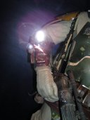 More details of the upper parts of the commando costume. A rectangular plaque on the commando's left shoulder may be a comlink like the gadgets worn by rebel soldiers on Hoth. Unclasped helmet straps hang near each side of the neck. |