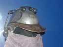 The front of an Imperial pilot's helmet. Air hoses connect to the area where stormtroopers normally have two bolt-like plugs. This pilot has nothing written on his crest; some others do have a short word or symbols at the front end of the crest. The roundel of the Galactic Empire, in white colour preferred by the Starfleet, is painted to the left and right of the crest. The function of the metallic, semi-obscured area at the front of the crest is unknown. [Jan 2003] |