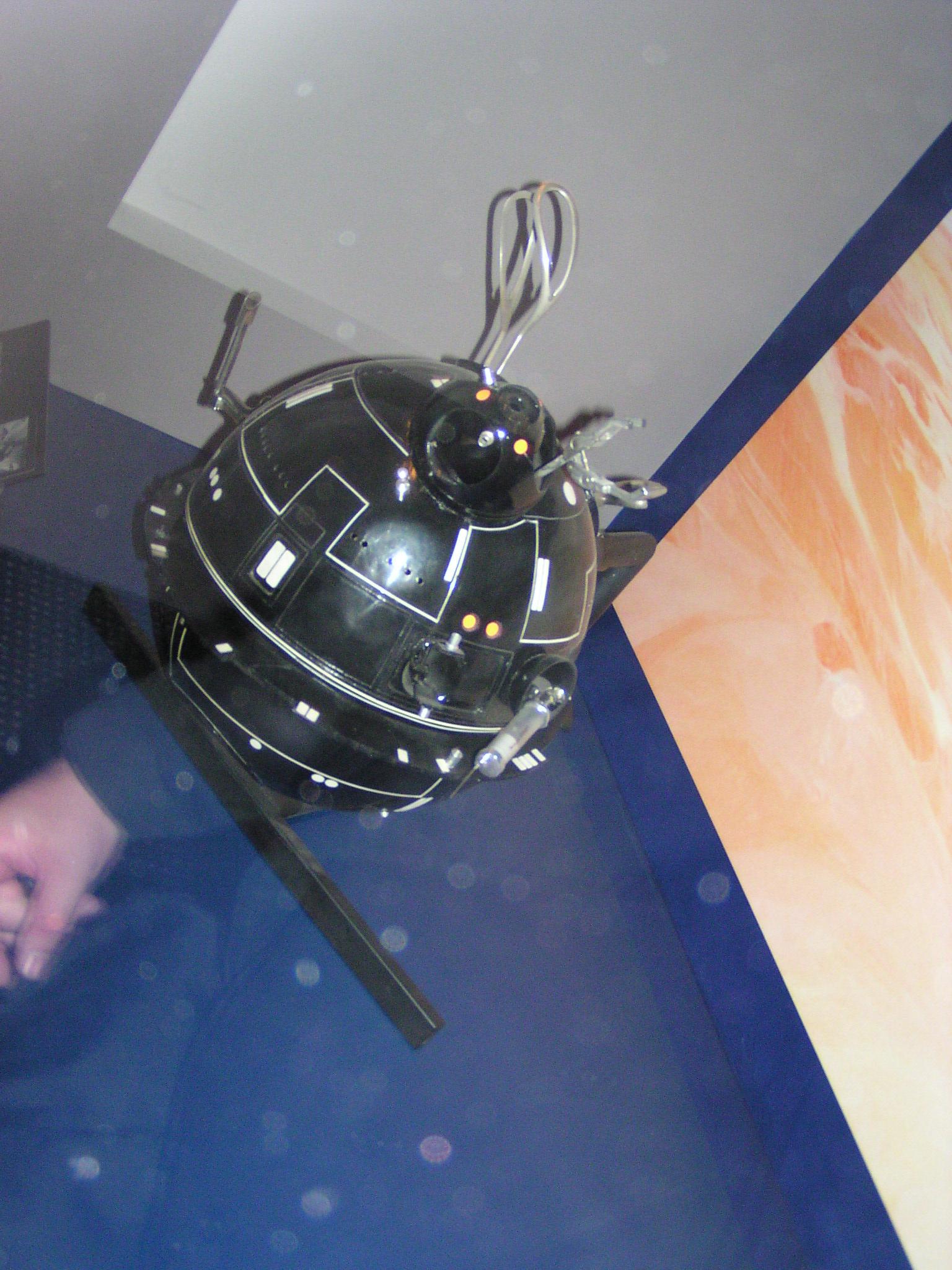 Under the right side of the interrogation droid. Some of the lower rear panel outlines are visible. |