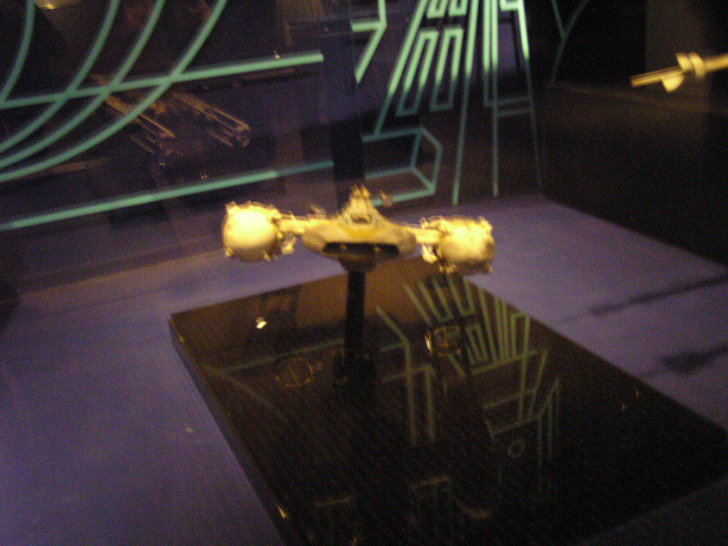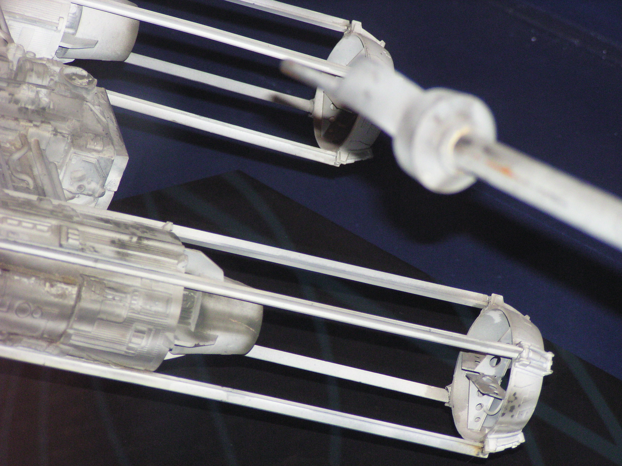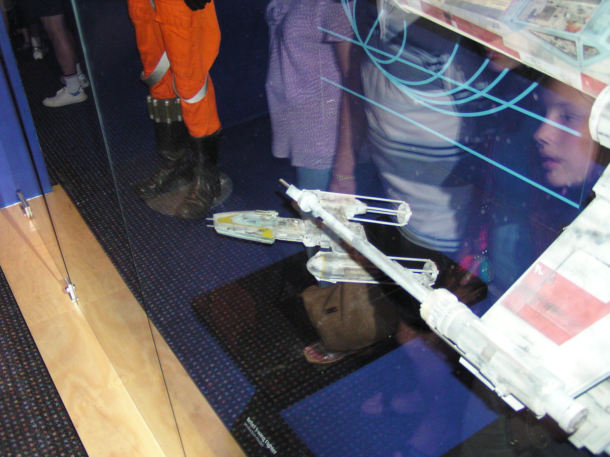 Overviews of the Y-wing fighter model on display near the large X-wing model in Sydney. Although heavily obscured by foreground reflections, this images are retained for the sake of their future potential use in stereoscopic measurement. [Jan 2003] |