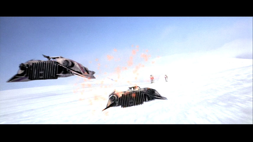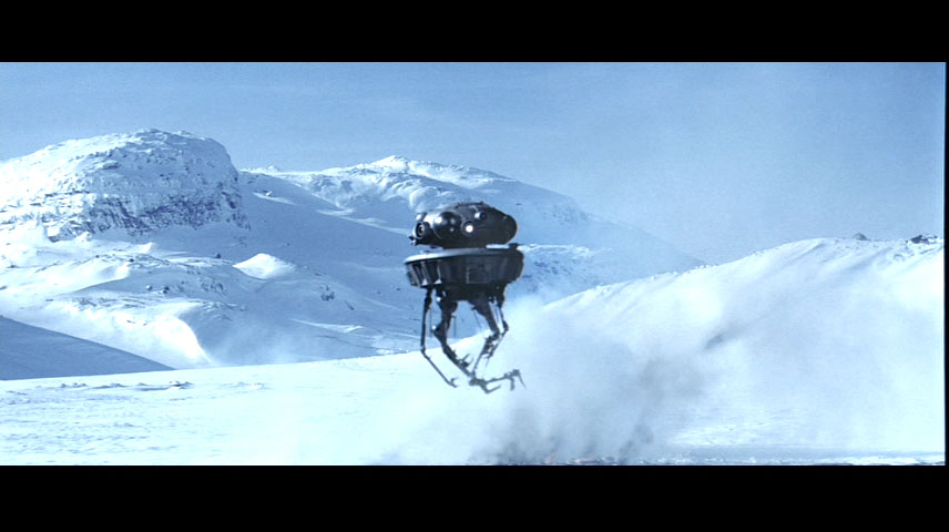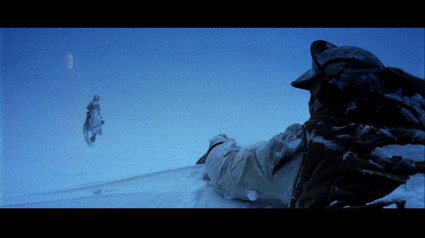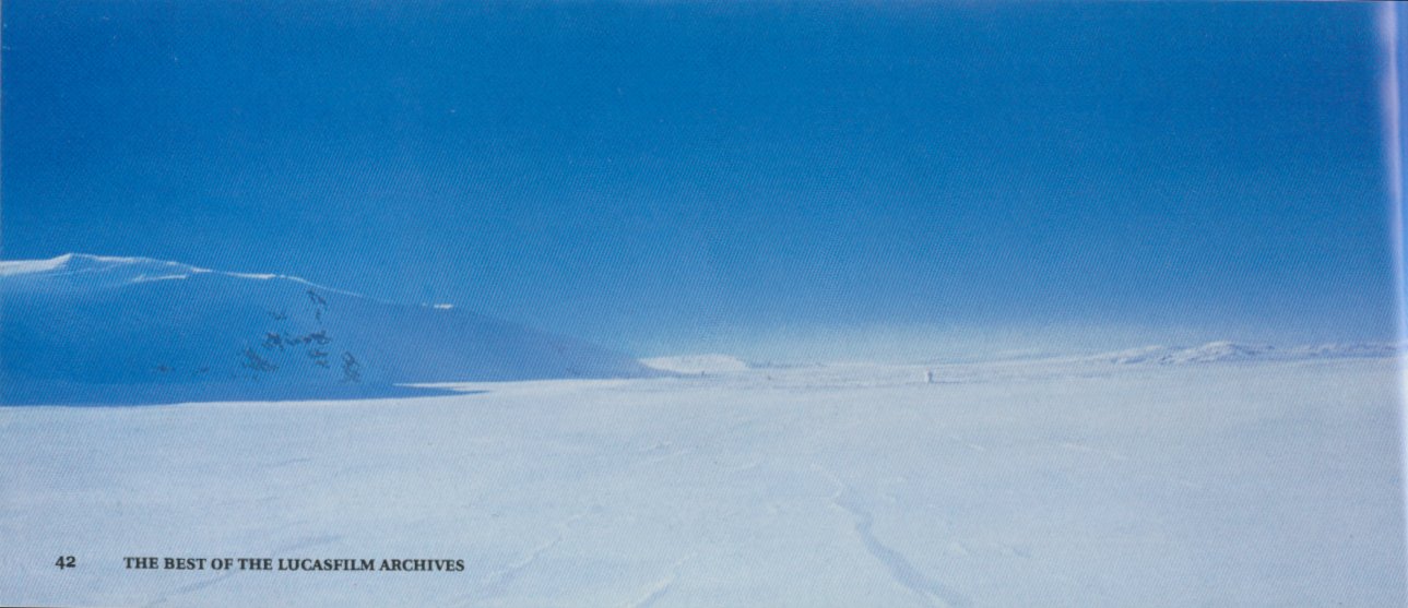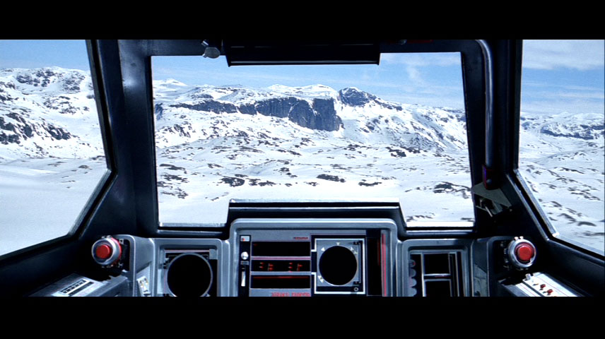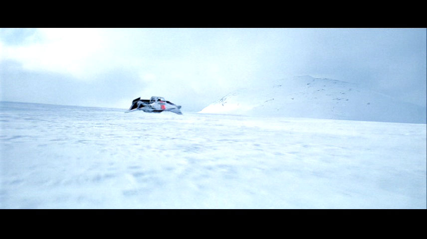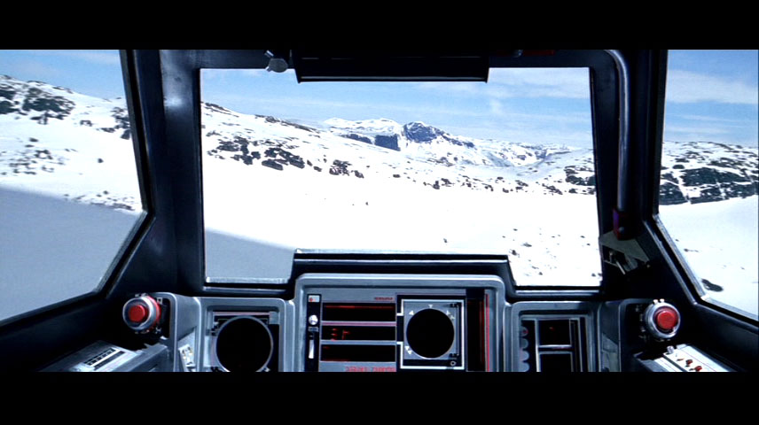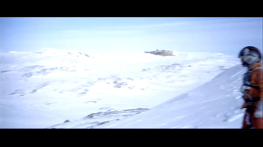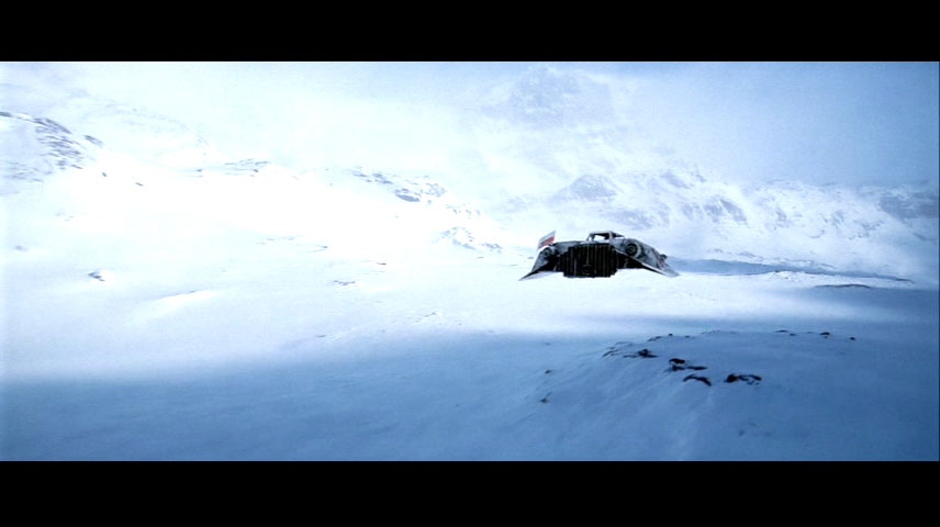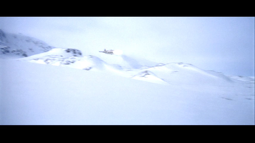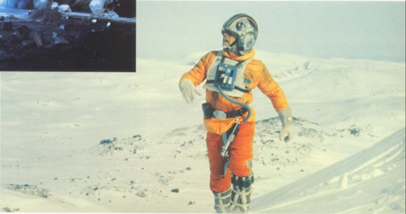 The probot landing scene is afflicted with a blooper. The event is shown twice, once from a universal, impersonal perspective and once as viewed by Luke Skywalker. Both shots are the same except that one of them is a mirrored image of the other. Which one is real? There are several restrictions. Luke Skywalker had a line of sight to the impact site. There is a steep mountain range nearby, and Luke was not on it. He rode across a flat plain with snowdrifts and little rock.