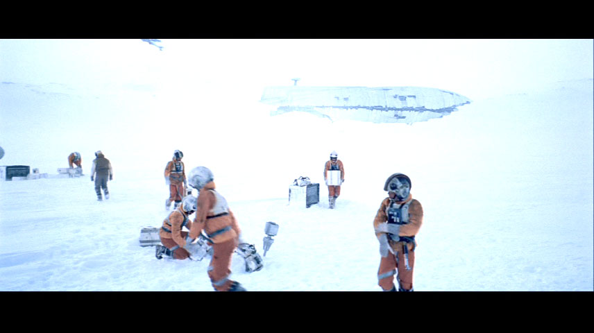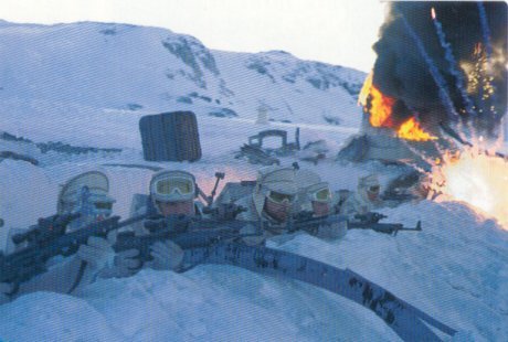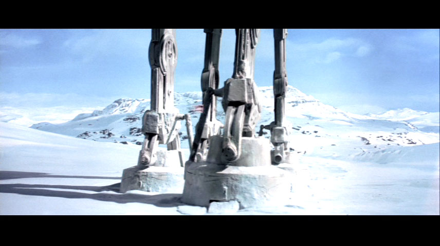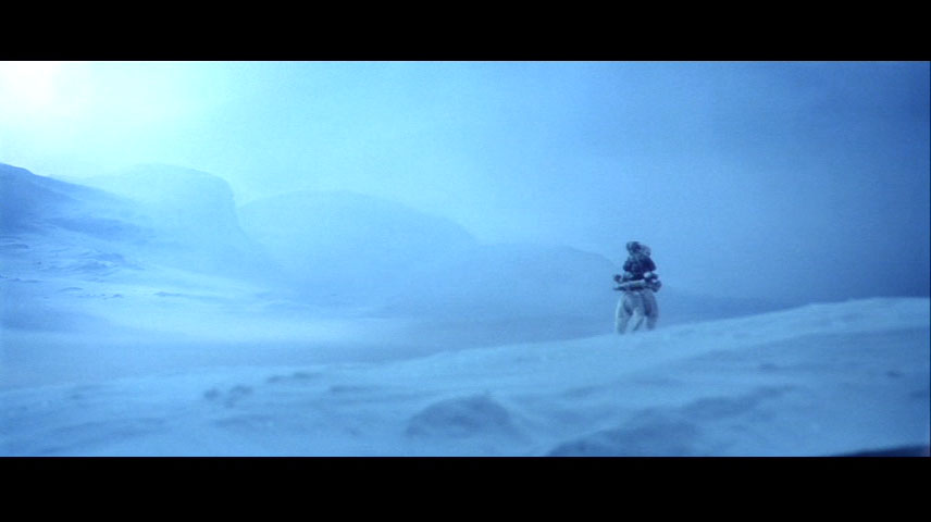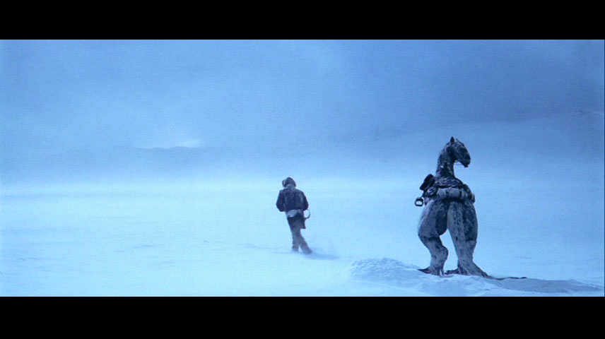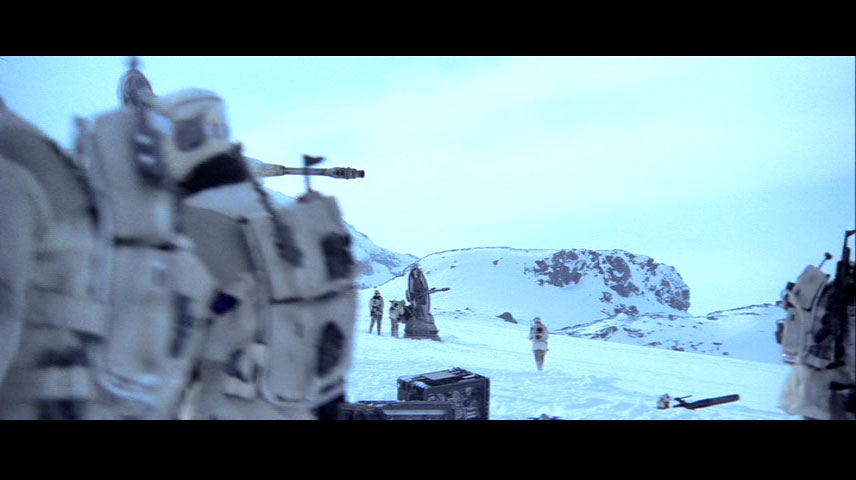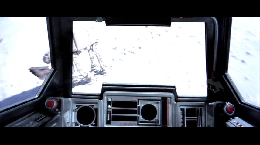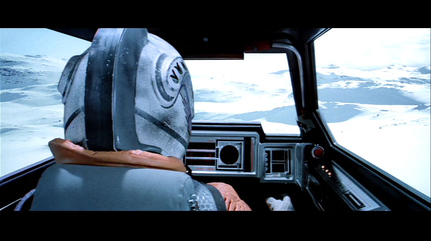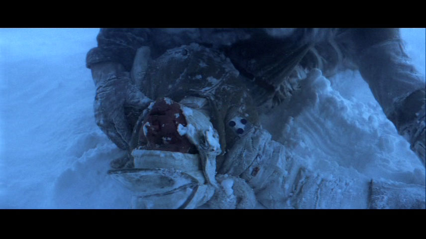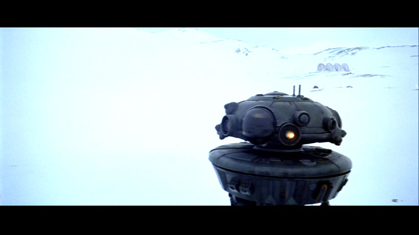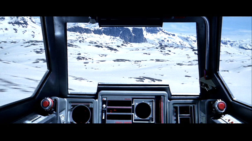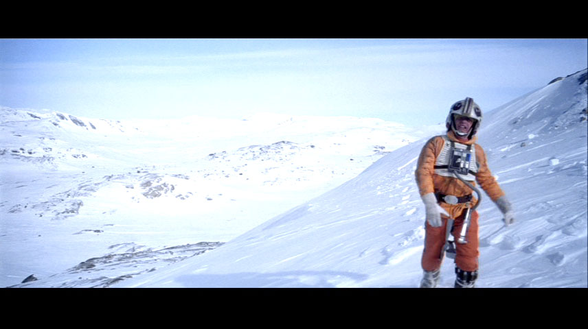The probot landing scene is afflicted with a blooper. The event is shown twice, once from a universal, impersonal perspective and once as viewed by Luke Skywalker. Both shots are the same except that one of them is a mirrored image of the other. Which one is real? There are several restrictions. Luke Skywalker had a line of sight to the impact site. There is a steep mountain range nearby, and Luke was not on it. He rode across a flat plain with snowdrifts and little rock.