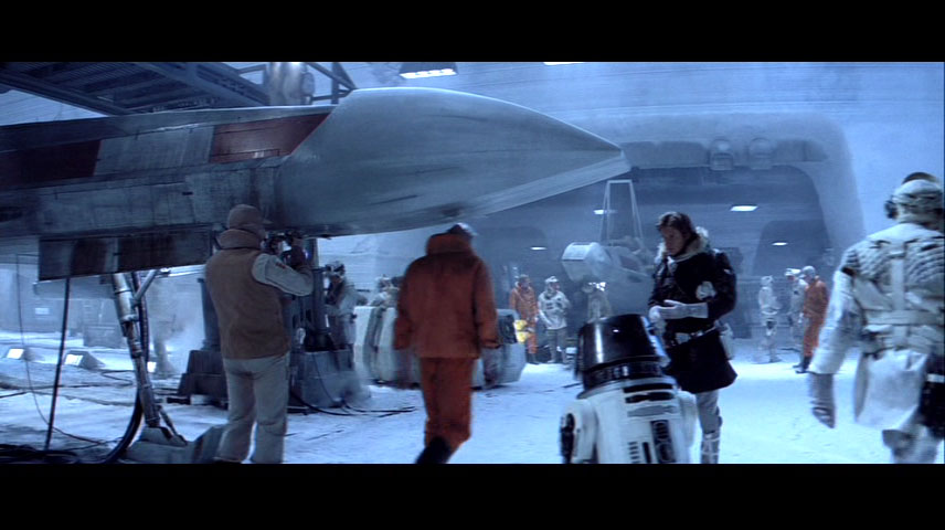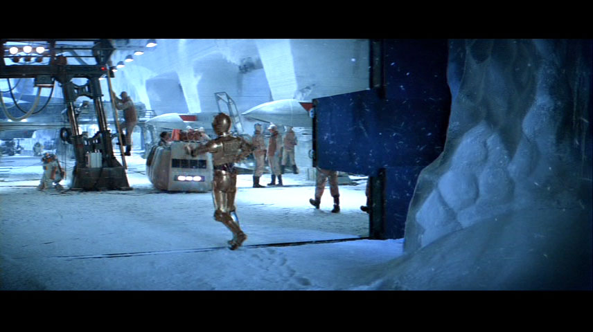Luke Skywalker makes his way to his starfighter on the south slopes, as the Millennium Falcon takes off from the hills behind him. Luke is walking across east-facing ground (according to the solar direction in the mid-morning definition). The Falcon must have kept near the ground after leaving the base, because its hangar was not the south one; the ship must have flow around to the south side.