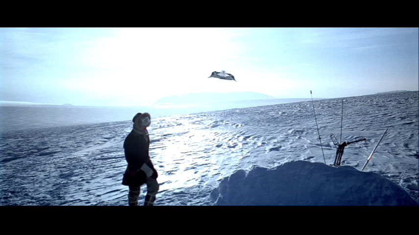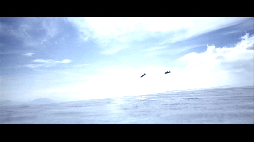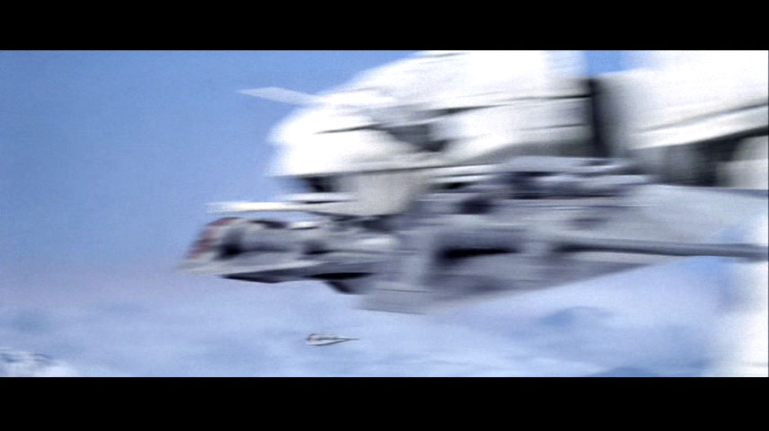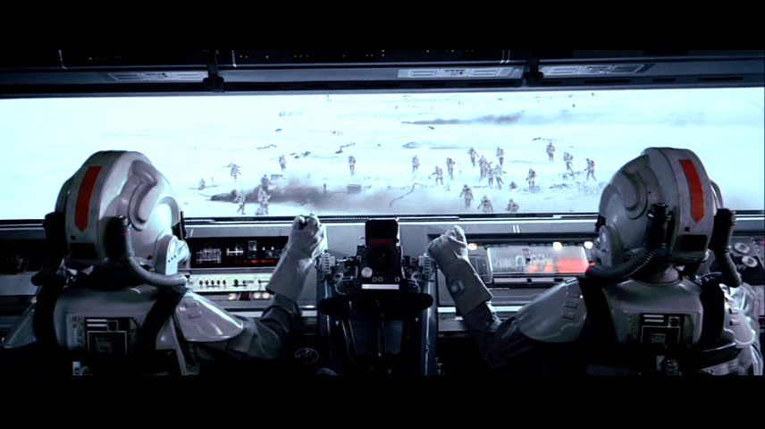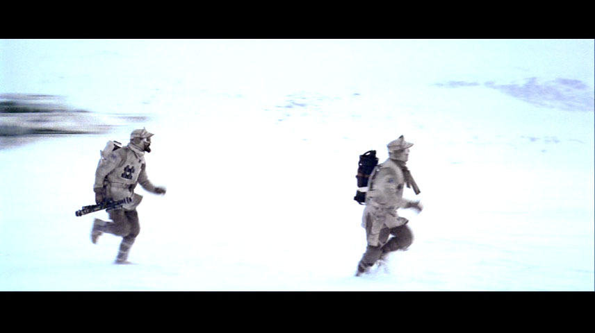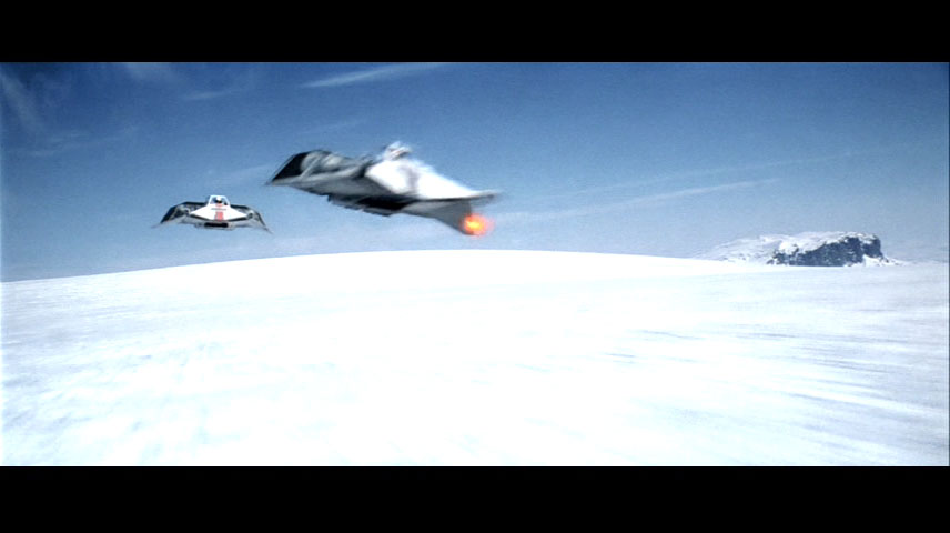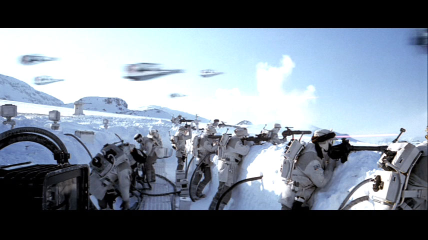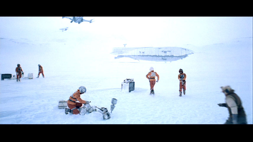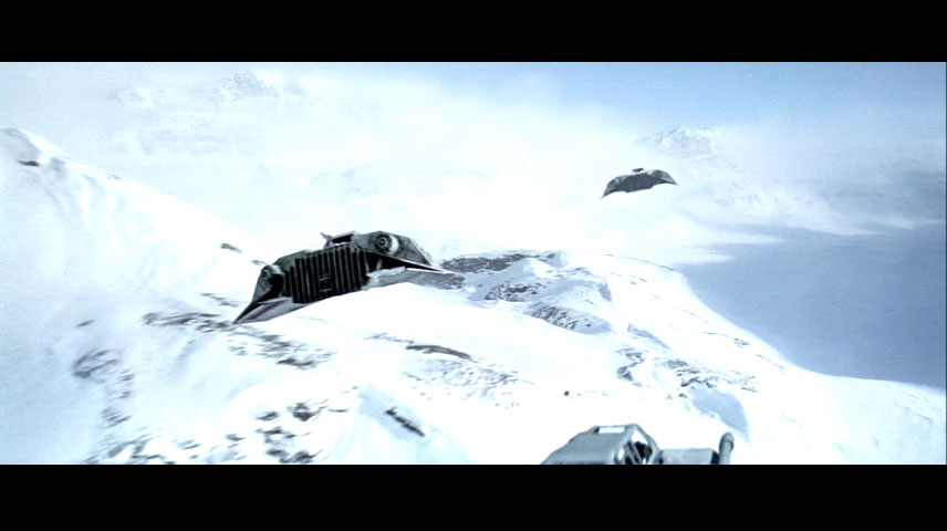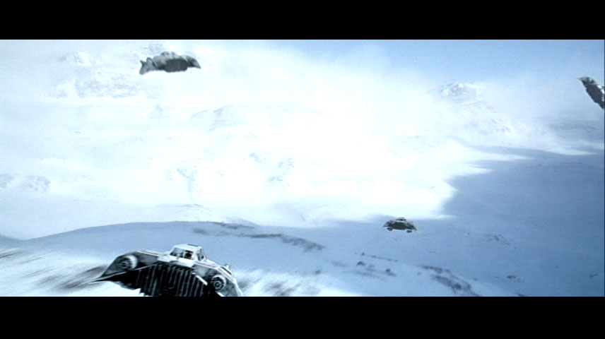 A pair of snowspeeders fly with the sun behind them. The solar direction is conventionally defined as east, if the battle occurs in the morning. Thus there is a wide flat glacier plain to the east of the main action of this stage of the battle.