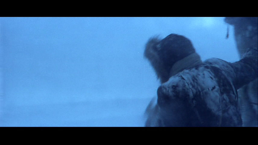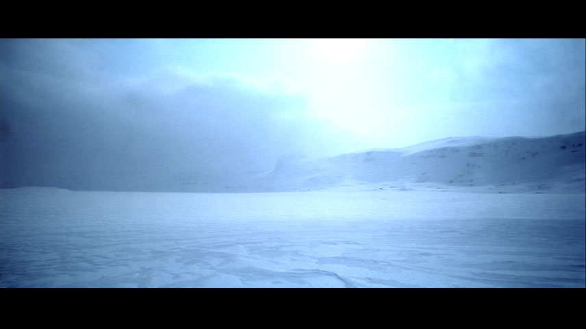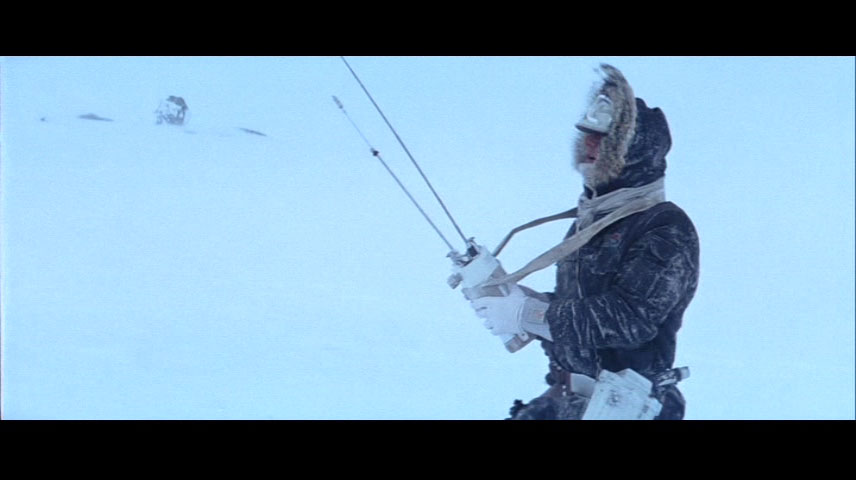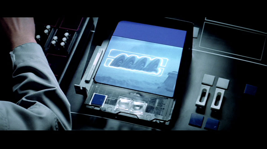 Views of the planet during the probot's arrival and Luke Skywalker's departure are almost identical. The camera is oriented differently and the globe is shaded differently for different times of day. At the longitude of Echo Base, it was later afternoon when the probot landed, and late morning when Skywalker left. Note the jagged band of ocean which meets the horizon in both images, and the icy subcontinental land masses near the visible limb of the planet.