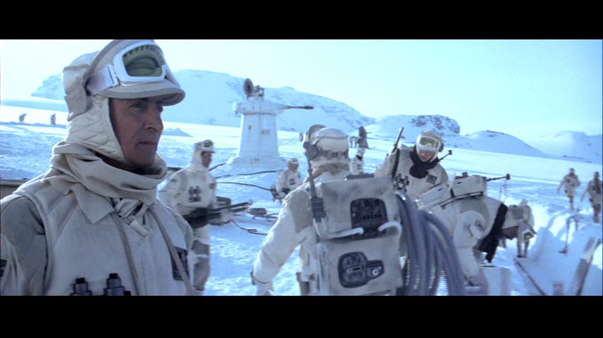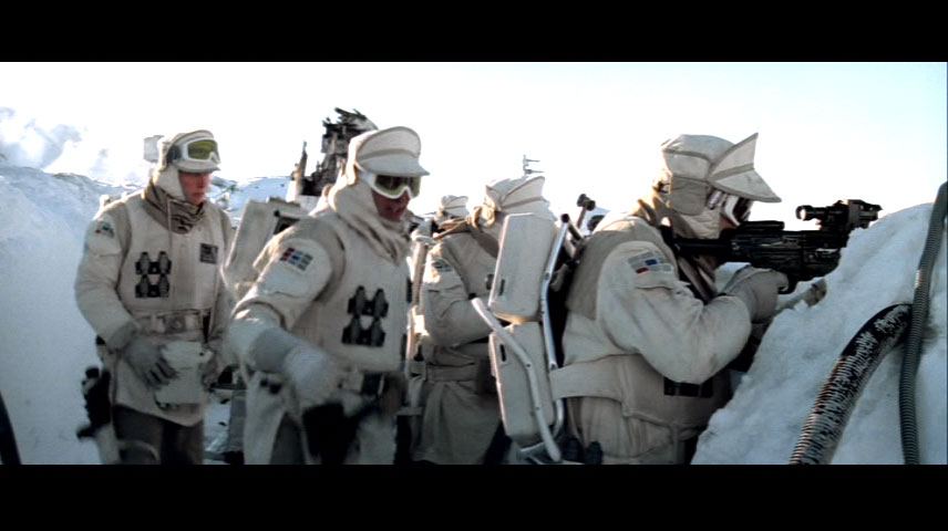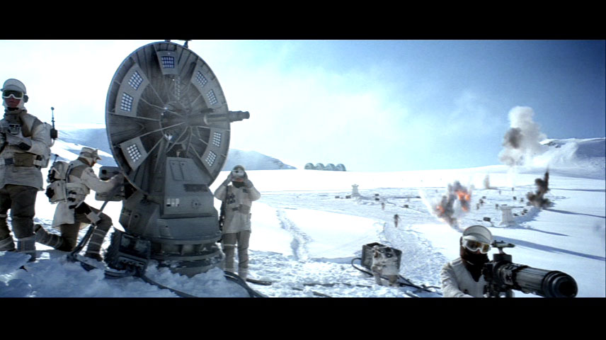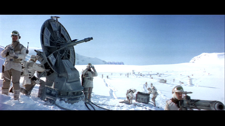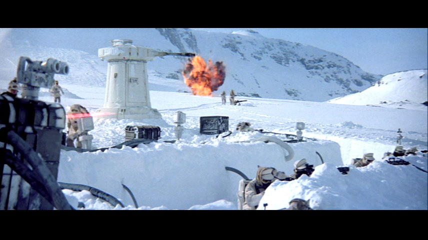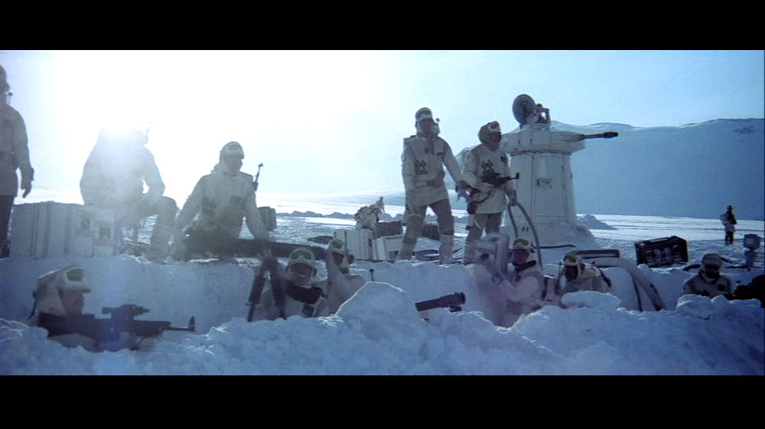 This is the North Ridge, as seen from the rebel trenches. The walkers are first spotted when they are on the North Ridge. The cloud or mist drifting off to the left is interesting; it may be rising steam associated with the landing site of the Imperial barges. If so then the distribution of the cloud indicates something about the wind direction. The sunlight appears brightest in the direction of the Ridge. What does this mean in terms of the planet's spin and time of day? NB: the North Ridge is north of something, but not necessarily north of this picture's vantage in the trenches. Perhaps it is north of the base, but east of the trenches and power generator?