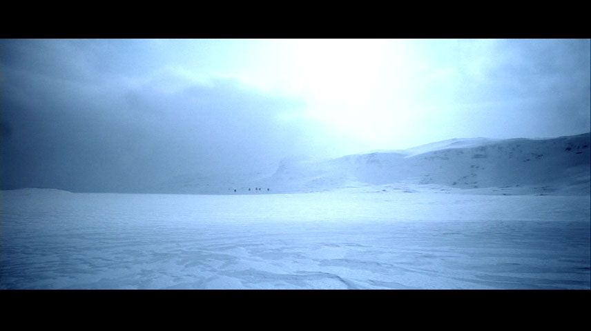 These walkers appear to have moved into shadow. There must be a hill or mountain off camera to the right or behind the viewer. Note the knobbly mountains behind the two walkers; the same background is seen later, behind two walkers after Wedge's kill.