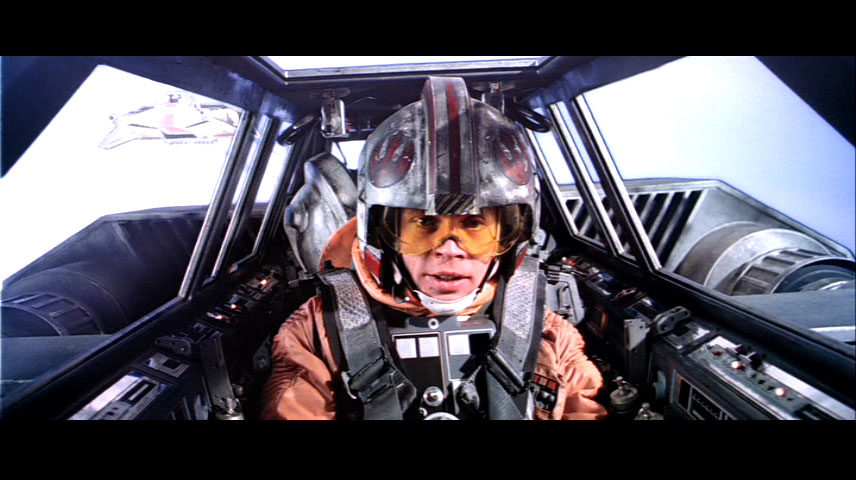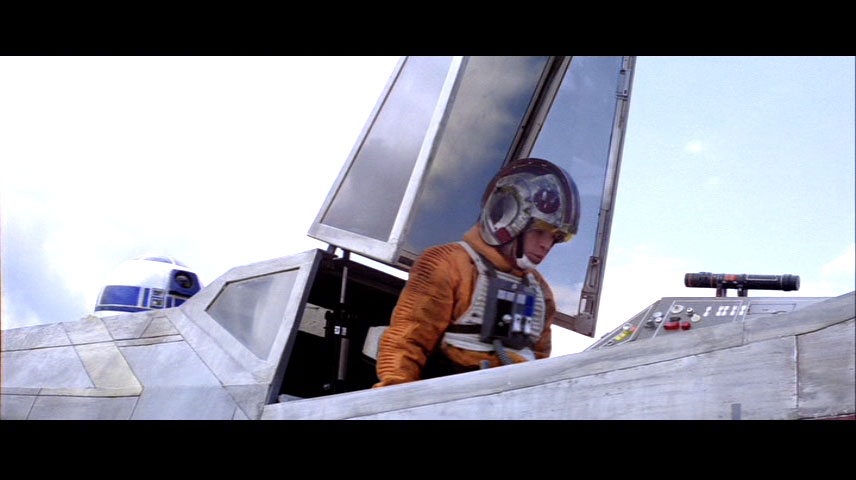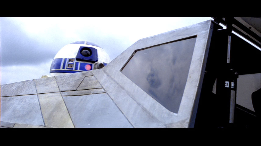The south slope launch point for the rebel starfighters and the last transport ship. The head of R2-D2 seems to be illuminated from his left, suggesting that Luke's X-wing is facing south.