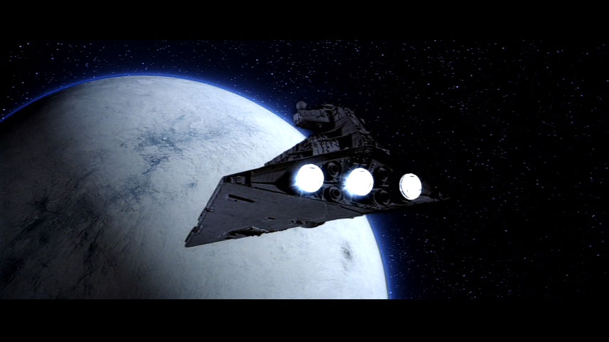 Two shots from the launch of the first rebel transport are worth comparison, since they are effectively simultaneous. One shows the whole globe from a vantage point near the star destroyer Tyrant. The other shows a closer view past the transport at the moment when the ion cannon opened fire. The two views are not at the same angle relative to the planet; the terminator is at a different relative meridian. One or two moonshadows are visible in thge longer-range picture.