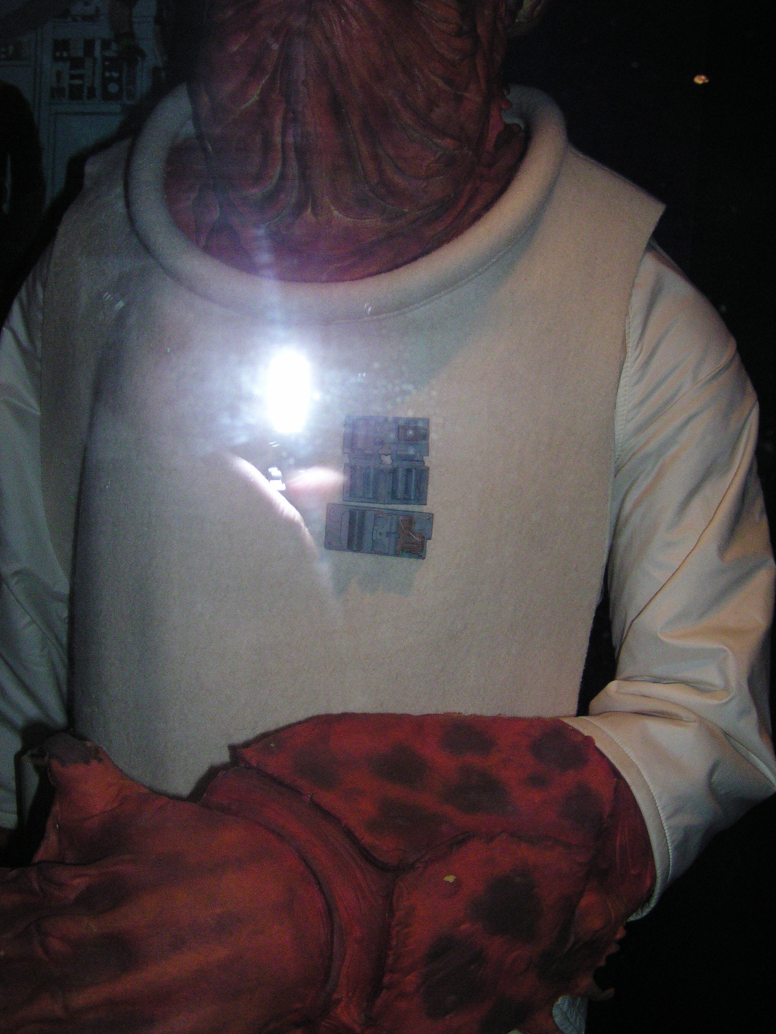 Clear side view of Admiral Ackbar in uniform: beige jerkin, white shirt and white trousers with a yellow outside seam, which is similar to the trouser stripes of Princess Leia and Calrissian.